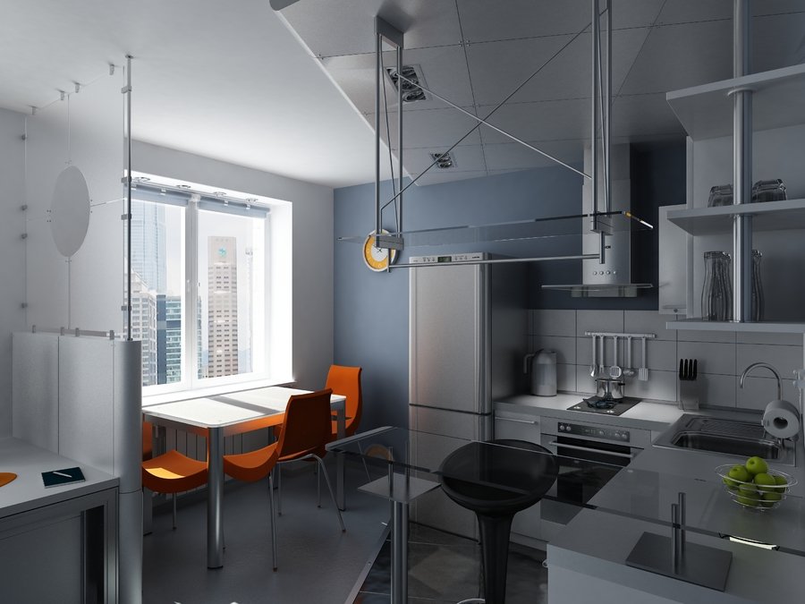 Además, vale la pena considerar cuestiones de campanas para edificios de apartamentos. Póngase en contacto con un diseñador profesional que pueda brindarle asesoramiento competente. Haga un plan de estudio de cocina con mediciones precisas de la ubicación de las fuentes de agua, gas y electricidad. No es necesario seleccionar la zona "con margen". Preste atención al alféizar de la ventana, que se puede ampliar para convertirlo en un lugar de trabajo o en un área de recreación y almacenamiento. Es mejor rechazar todo lo que no se utiliza. Visitas a pocas personas y estás acostumbrado a comer en cafeterías, lo que significa que debes revisar las áreas funcionales del estudio en dirección a un lugar de descanso o trabajo completo. Si es posible, use el planificador en línea para seleccionar muebles, pisos, colores, etc. El diseño de la cocina ocurre:
