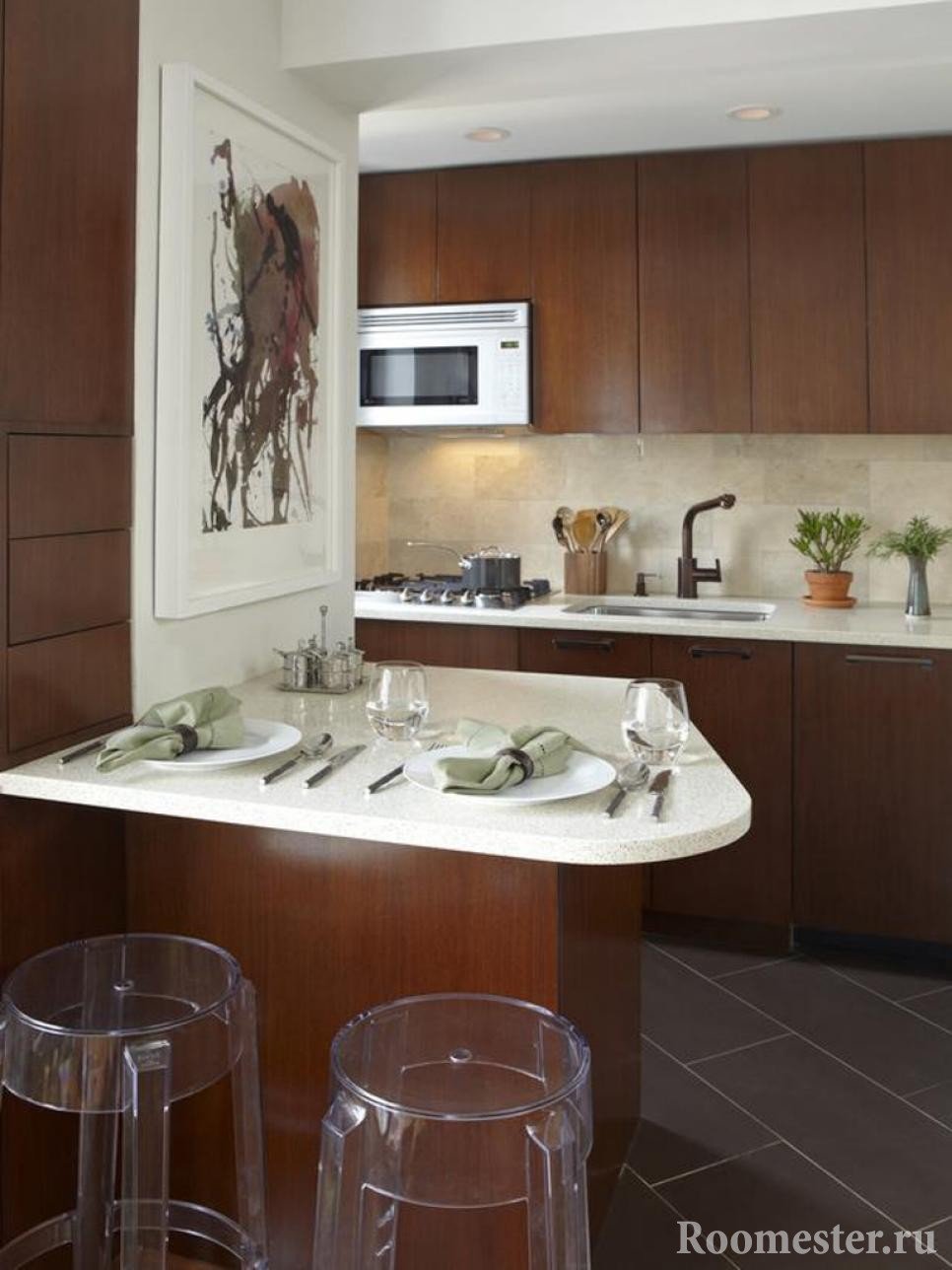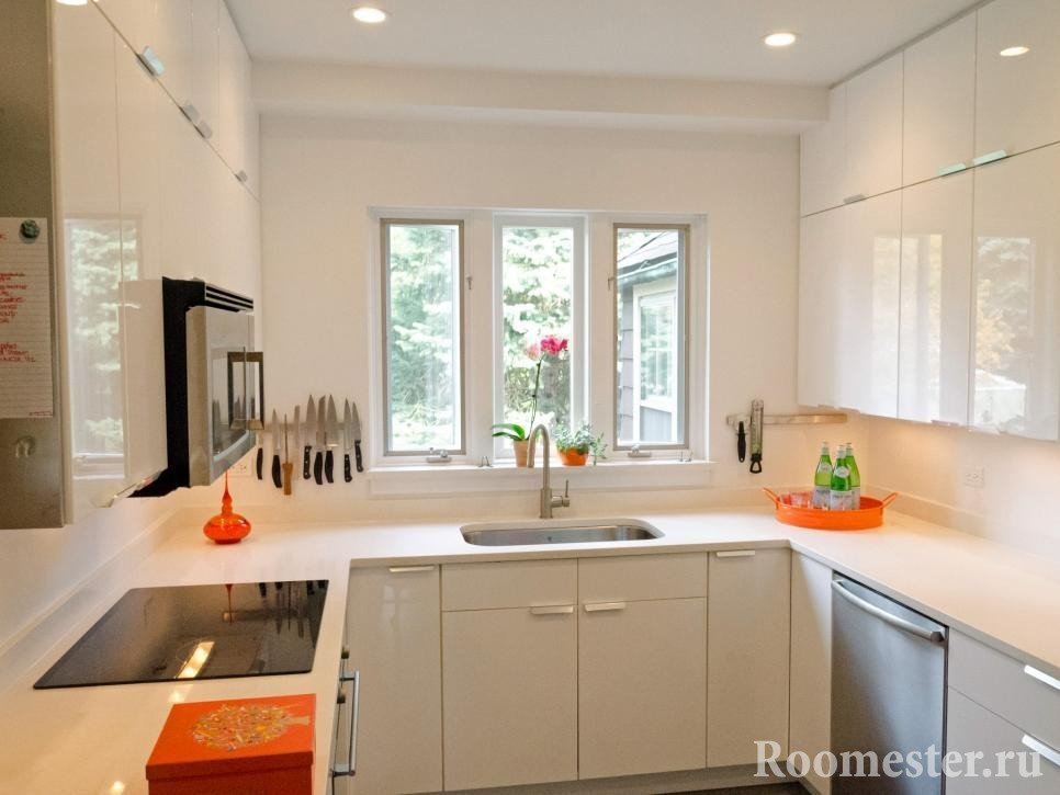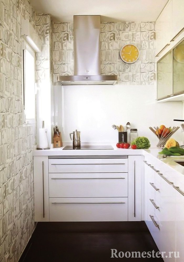 En forma de U Los muebles en este caso se colocarán en forma de letra P (en otras palabras, ocuparán 3 paredes de la habitación). Tales opciones de diseño para una cocina pequeña le permitirán acomodar absolutamente todo lo que pueda necesitar una ama de casa: sistemas de almacenamiento y todos los electrodomésticos necesarios (incluido un refrigerador espacioso). Lo único para lo que no hay absolutamente espacio es para un grupo de almuerzo, y aquí hay suficiente espacio libre para moverse solo para una persona.