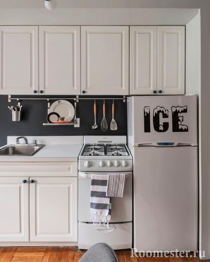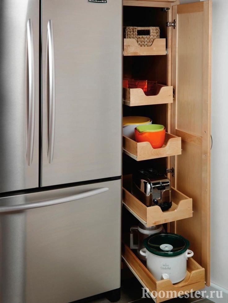 La puerta ¿Se usa con frecuencia la puerta de la cocina? Si no, puede deshacerse de él de manera segura para ahorrar unos pocos centímetros. En caso afirmativo, es mejor reemplazar una hoja de puerta con bisagras en un compartimento.