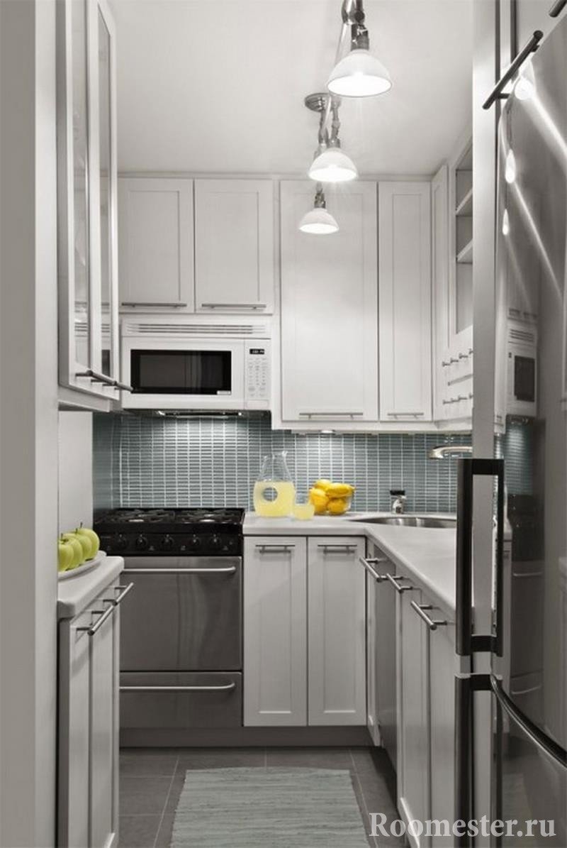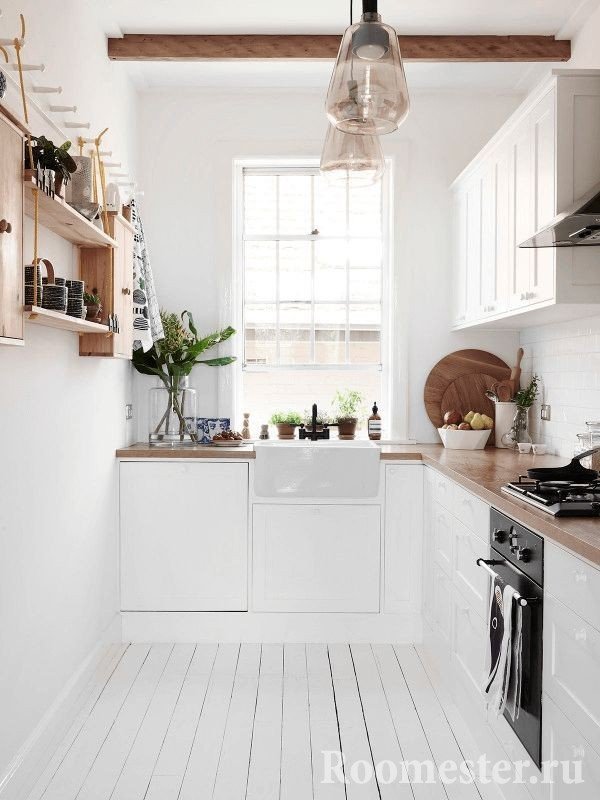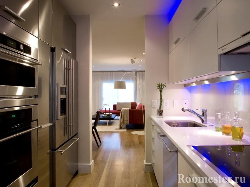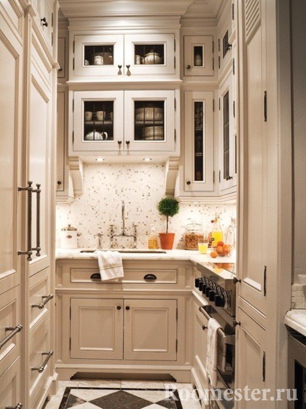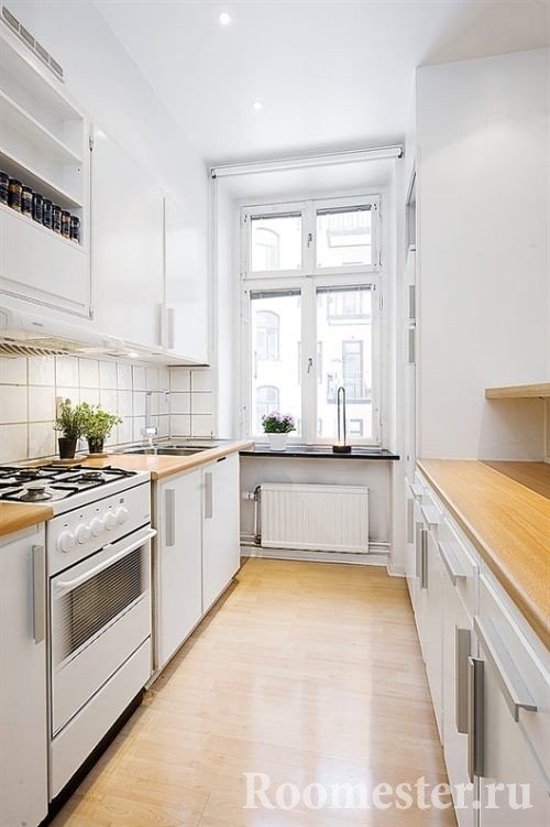 Paralelo (los gabinetes y electrodomésticos están expuestos a lo largo de dos paredes paralelas). El uso de este diseño debe ser muy cuidadoso, ya que es adecuado solo para habitaciones cuya forma es cercana al cuadrado. Después de arreglar los muebles, no habrá absolutamente ningún espacio libre, lo que significa que tendrá que rechazar la mesa del comedor (o llevarla al comedor). Al mismo tiempo, organizar un "triángulo de trabajo" con una estufa aquí tampoco es un problema.
