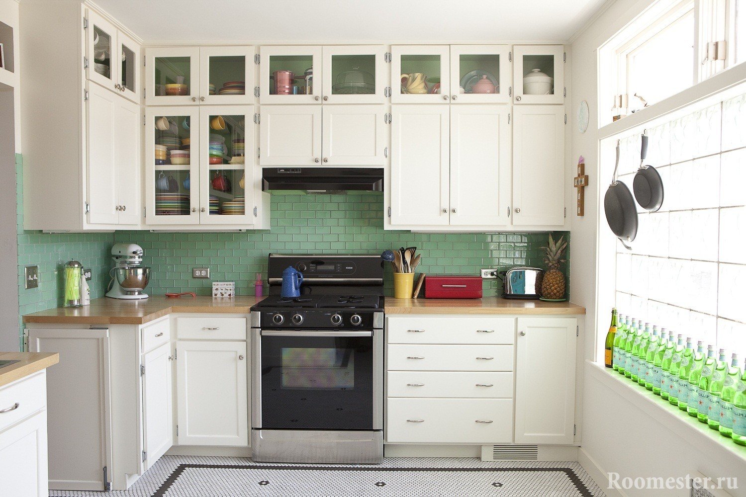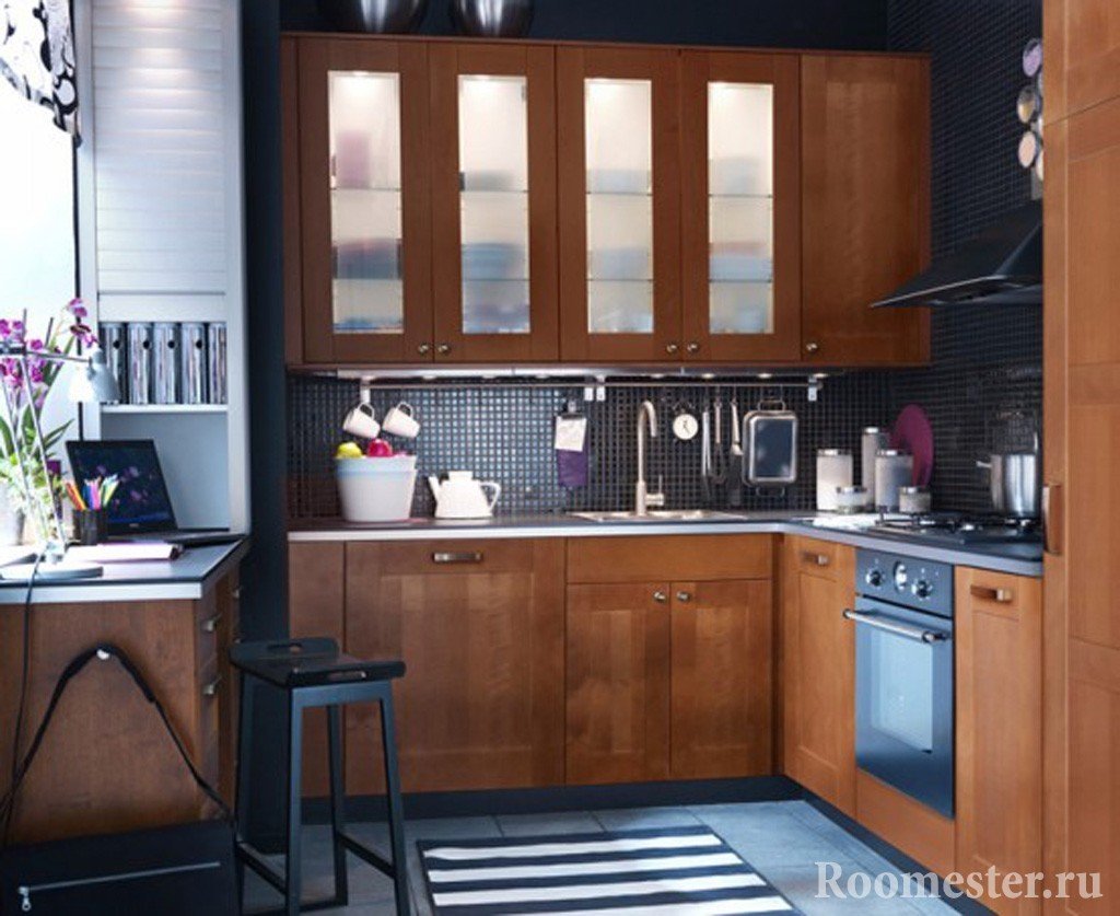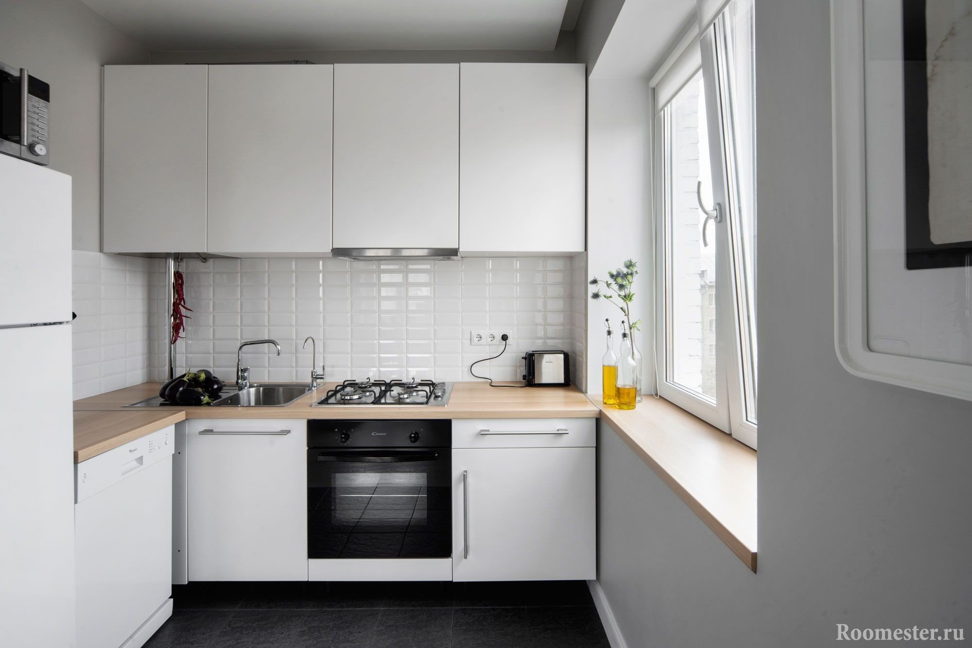 Superficies de trabajo. El diseño de cocinas pequeñas debe tener en cuenta las características funcionales de la habitación. Para ahorrar espacio, todas las superficies deben hacerse funcionar (alféizar de la ventana también). Para lograr este objetivo, el alféizar de la ventana se puede hacer más ancho de lo habitual. A veces está hecho del mismo material que la encimera.