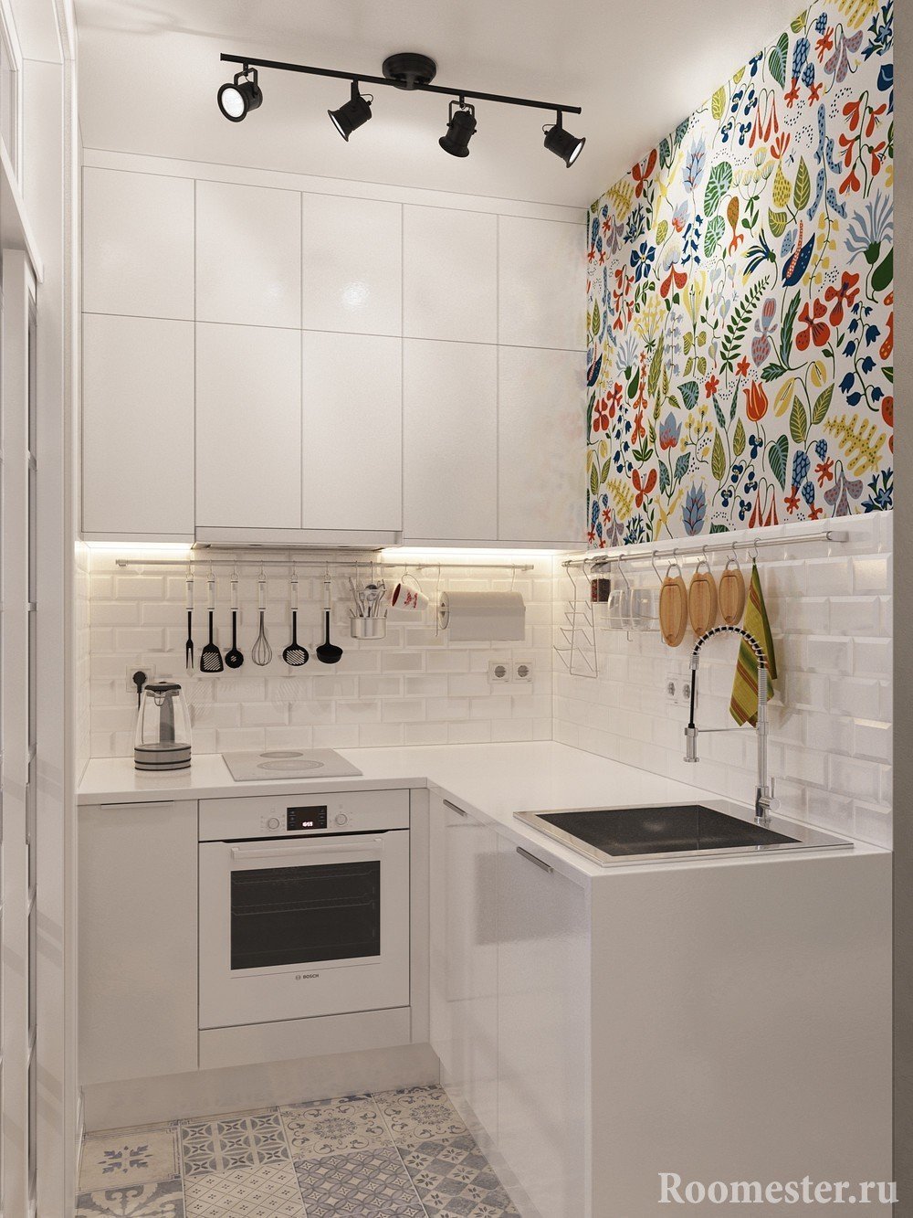 Colores brillantes Diseño de cocina para 5 metros cuadrados. m no privar completamente el color. Ultramarine, Bright Lime, Terracotta, Fuchsia agregarán a la habitación el brillo y los colores de la vida. Sin embargo, es mejor usarlos en detalle (este es el "delantal" del área de trabajo, encimera o fachada del refrigerador).