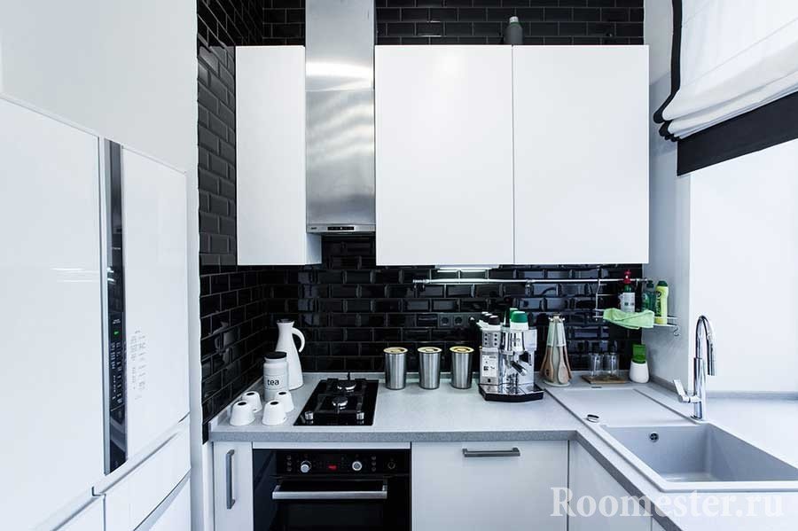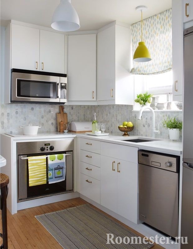 En forma de L (a menudo denominado angular). Tal diseño reduce ligeramente la cantidad de gabinetes y superficies de trabajo, pero esto no significa en absoluto que sea menos conveniente. Al elegir este diseño de una pequeña cocina, puede crear un pequeño espacio para el comedor. Además, el espacio de trabajo está ubicado de manera bastante orgánica: una mesa de corte, un fregadero y una estufa (triángulo de trabajo) se pueden ingresar perfectamente en el conjunto en forma de L.