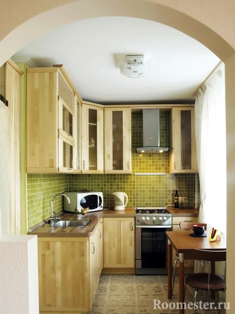Agrandar una pequeña área de cocina se decide combinando con otra habitación. Gracias a este enfoque, los electrodomésticos necesarios se colocarán en la cocina y habrá un lugar para un comedor. Para lograr esto, elimine la pared que separa la habitación de la cocina. Sin embargo, la mayoría de los diseñadores están de acuerdo en que esta no es la mejor opción. Es mucho mejor eliminar parte de la pared (esto se puede superar con éxito organizando una abertura en forma de arco o semi-arco). Por lo tanto, será posible ampliar el espacio de la cocina, pero al mismo tiempo observar una zonificación conveniente para las áreas de comedor y trabajo. Esto será especialmente importante al diseñar un estudio de cocina.