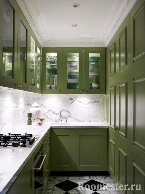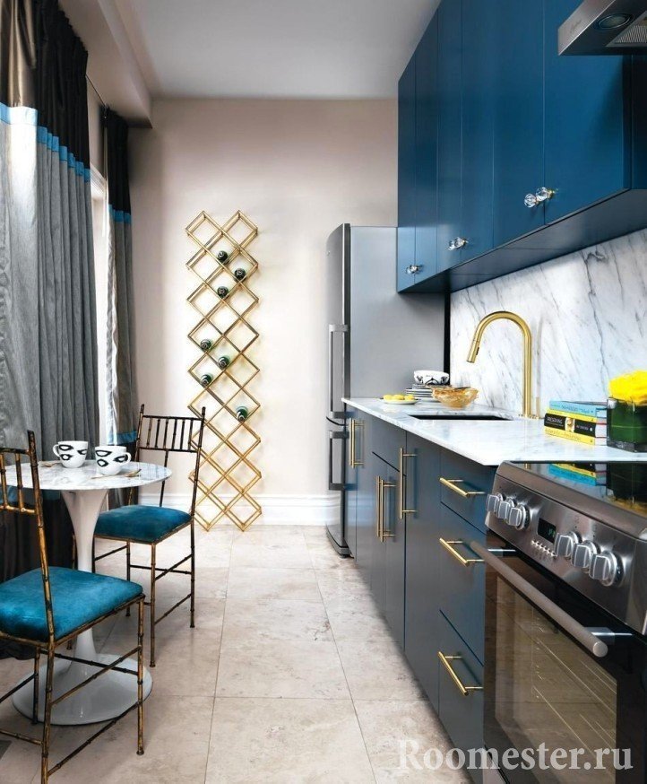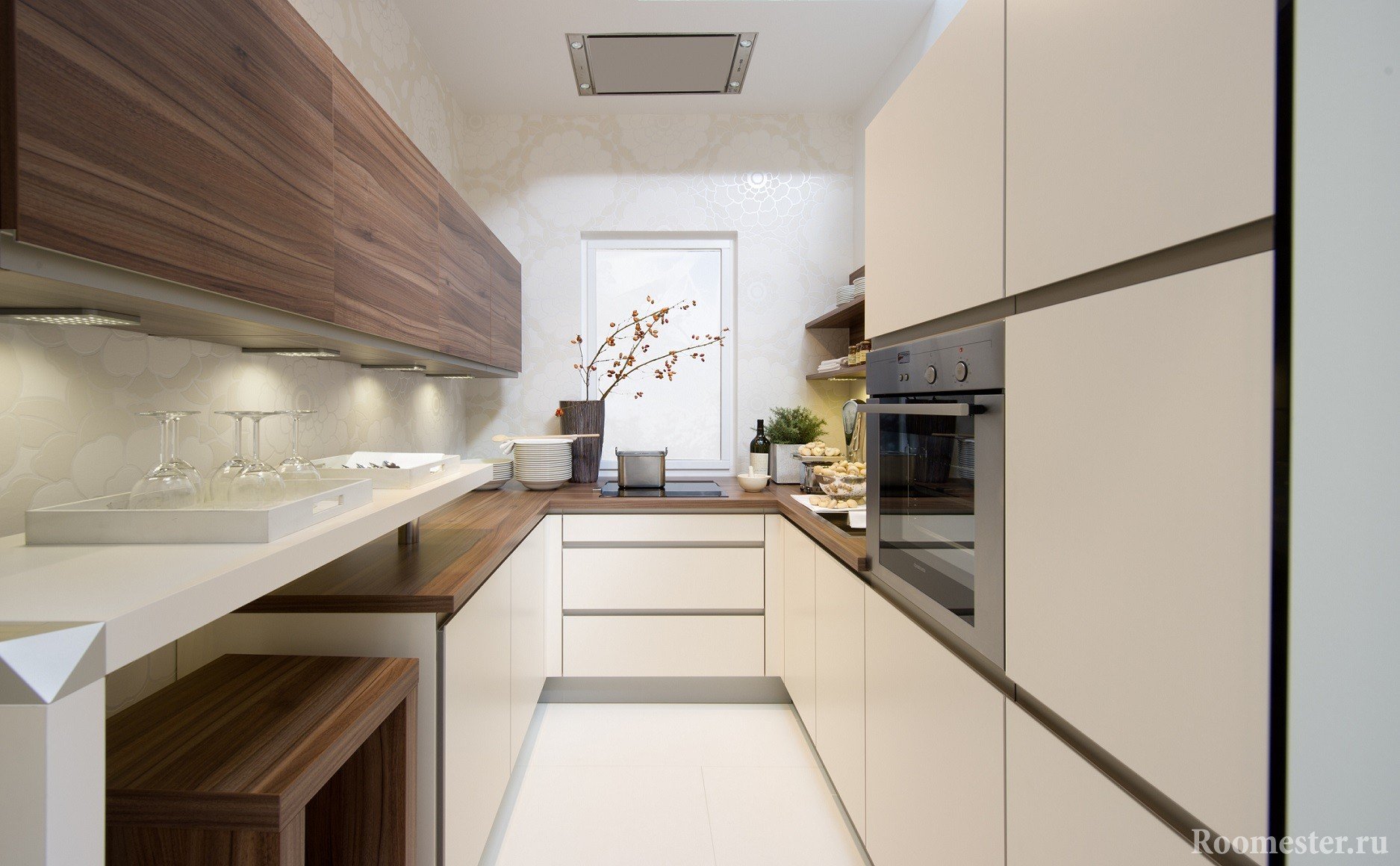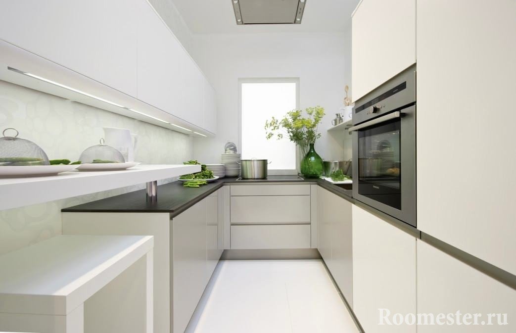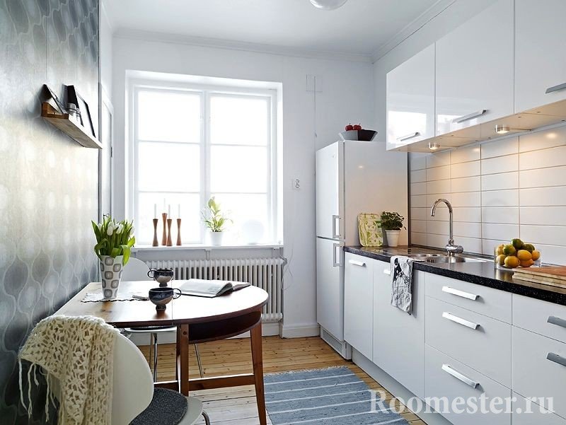 Un espacio muy estrecho de la cocina (menos de 2 m de ancho) implica una colocación en una sola línea del juego de cocina, muebles de comedor plegables. Para reducir el ancho de las encimeras, debe usar electrodomésticos de formato pequeño, módulos de cocina de dimensiones reducidas.