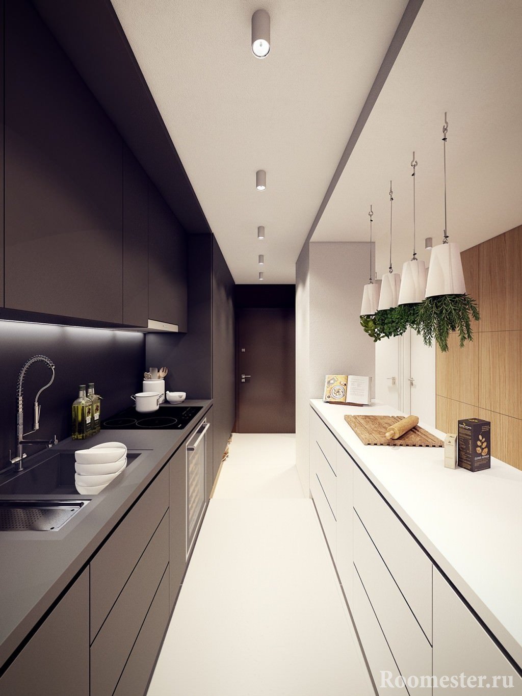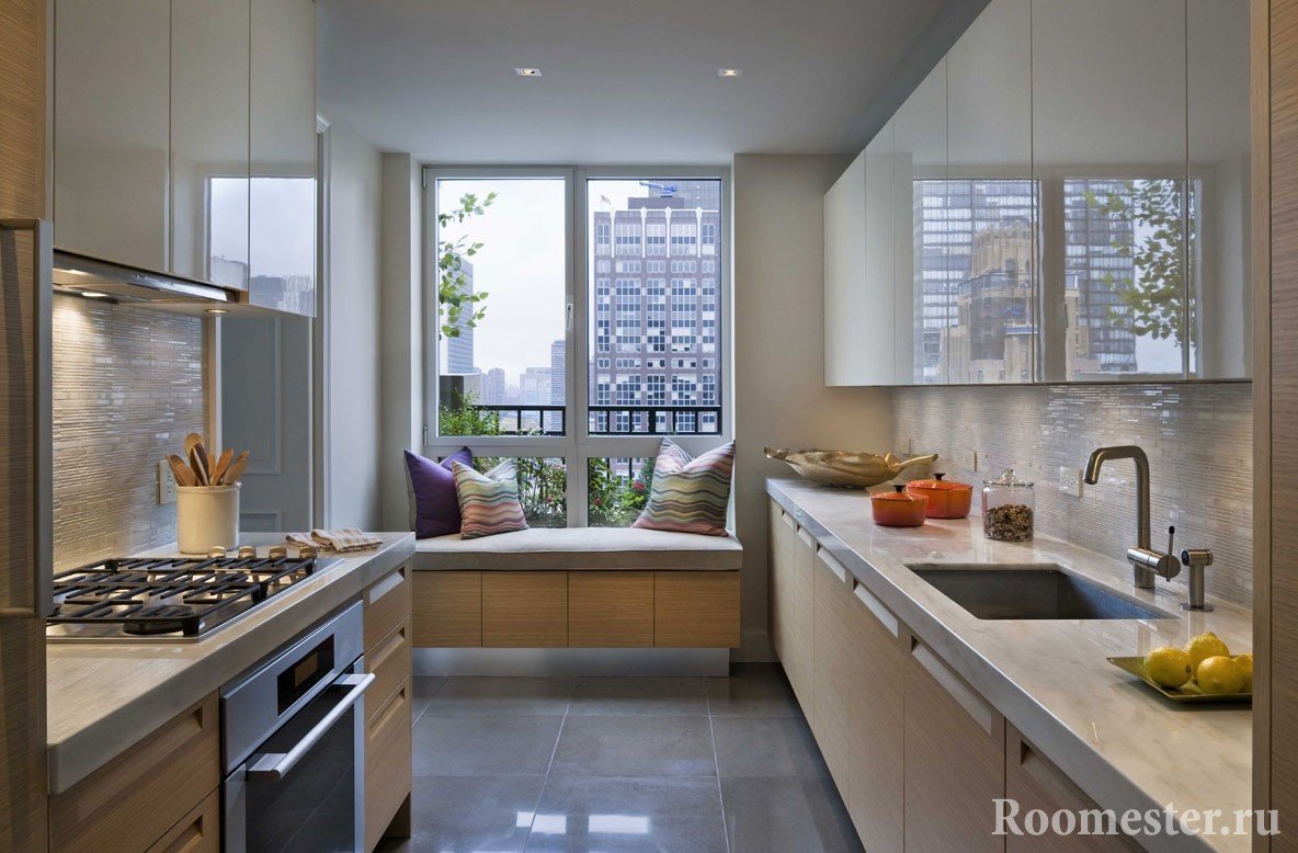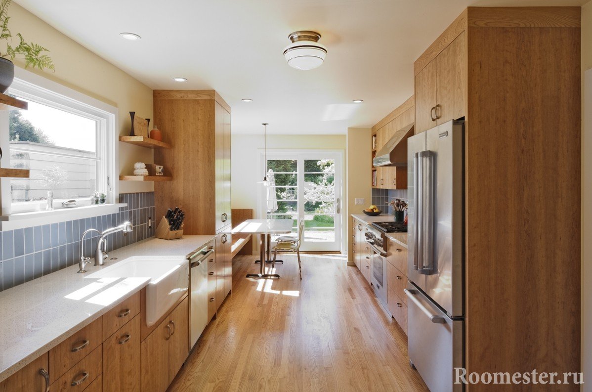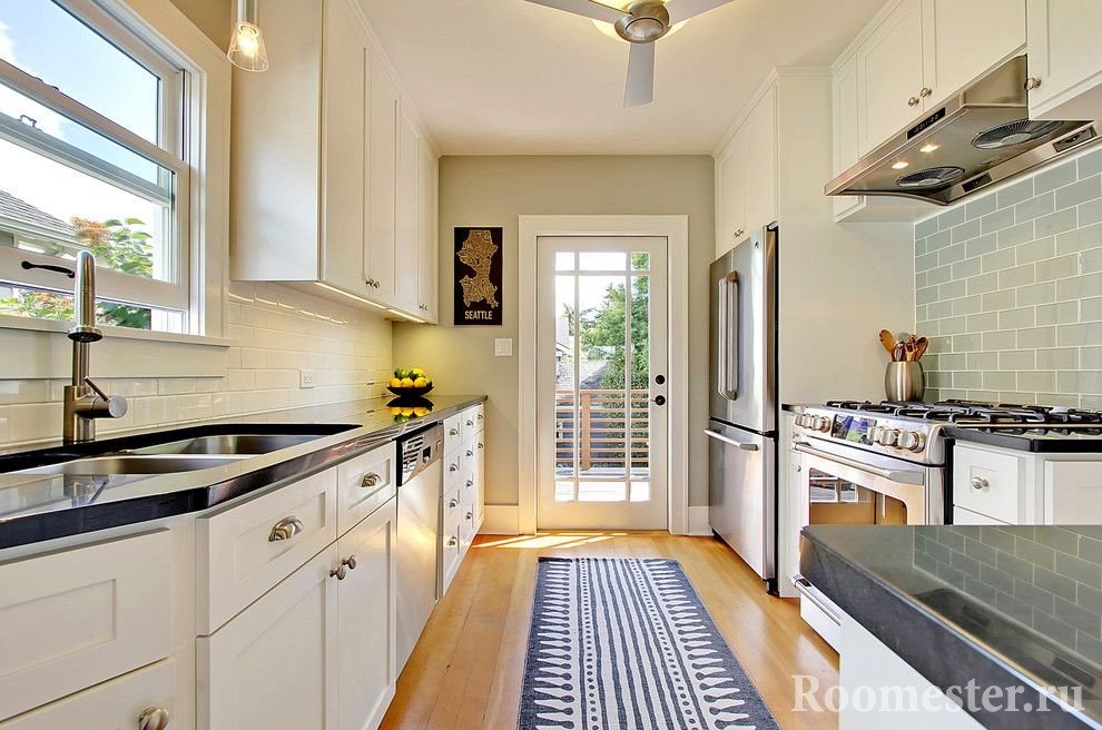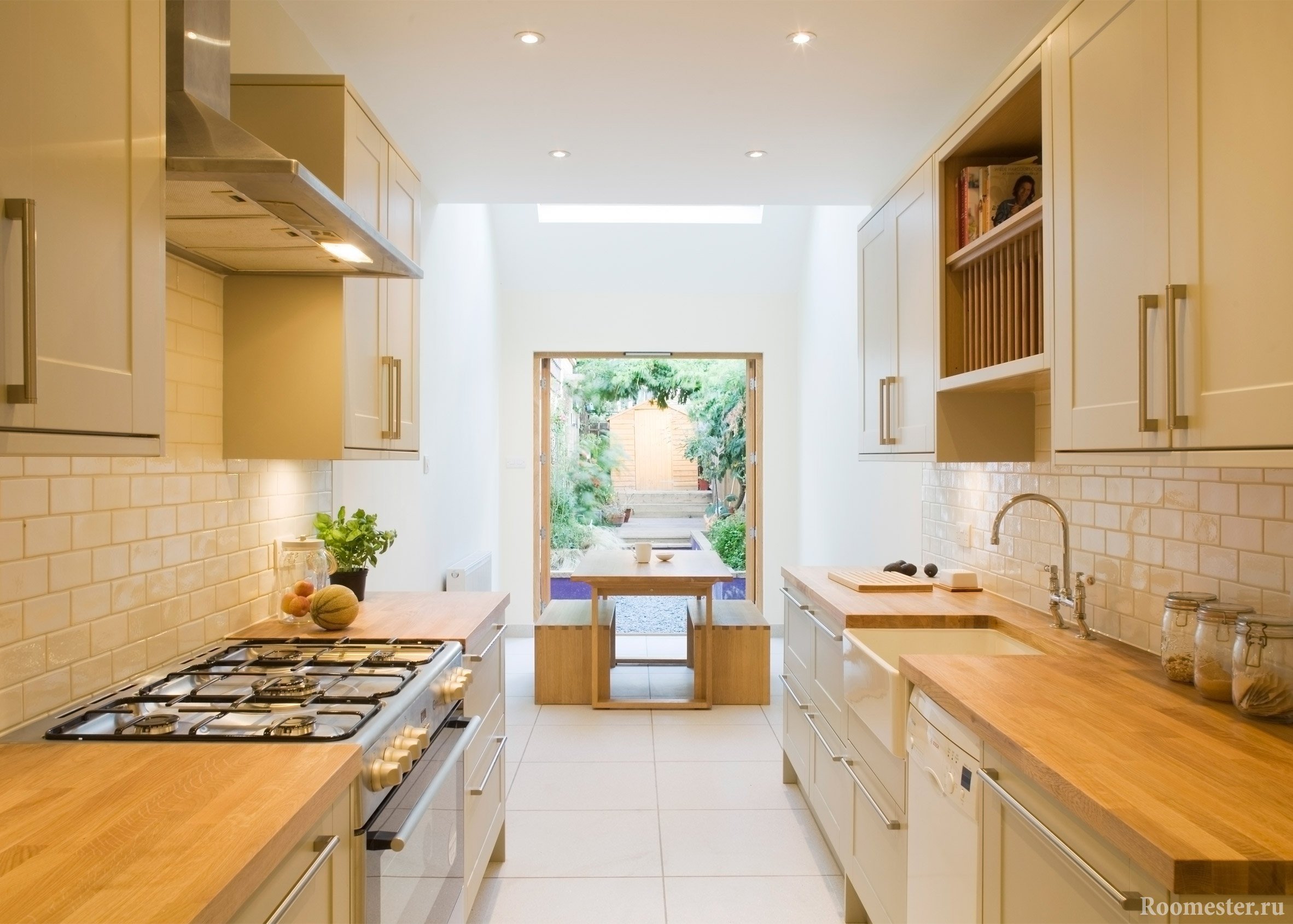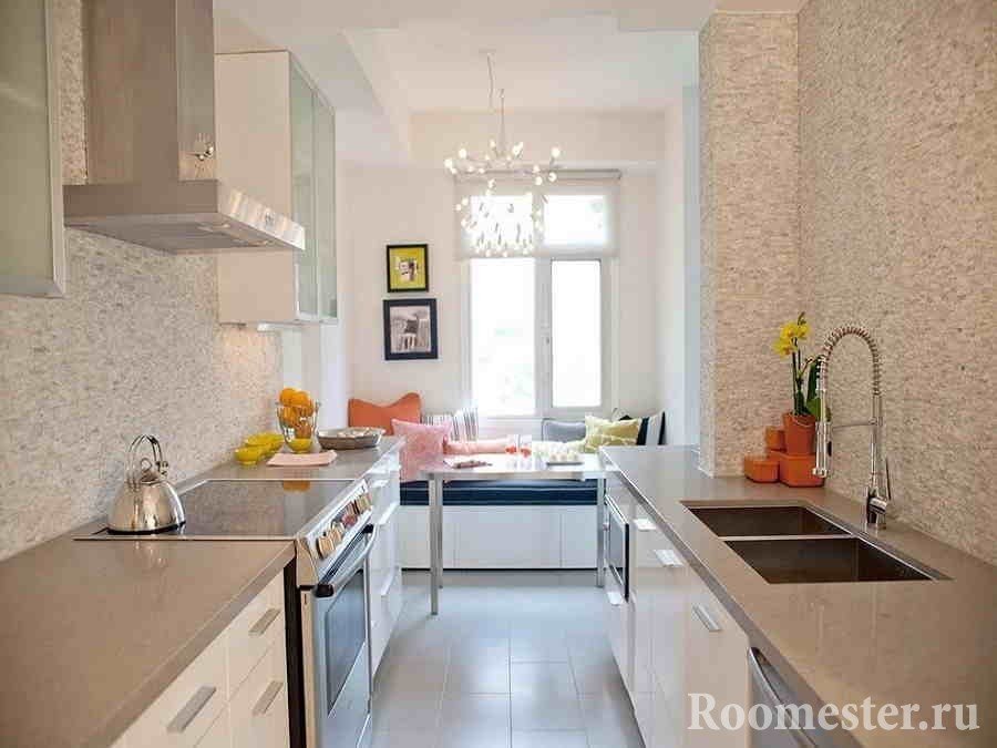 Con la puerta opuesta a la ventana al final y la longitud suficiente de la sala de la cocina, la técnica de diseño más óptima para una cocina estrecha será la división transversal del espacio en dos zonas: trabajo y comedor. El diseño de la zona de cocción es una opción paralela para colocar un juego de cocina. El pasaje dejado entre las líneas de trabajo debe permitir moverse a lo largo de la ruta "refrigerador - fregadero - estufa - encimera" durante la cocción y ser suficiente para garantizar la apertura libre de la puerta del horno, el uso conveniente de gabinetes de piso, cajones deslizantes.
