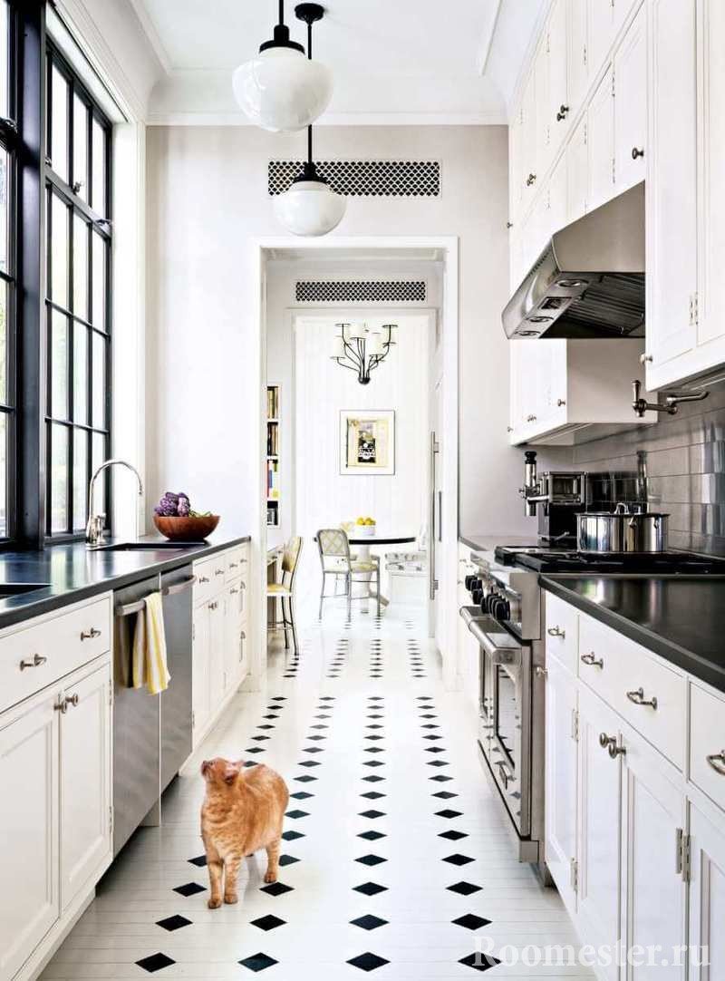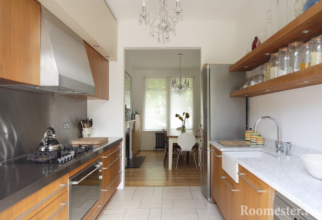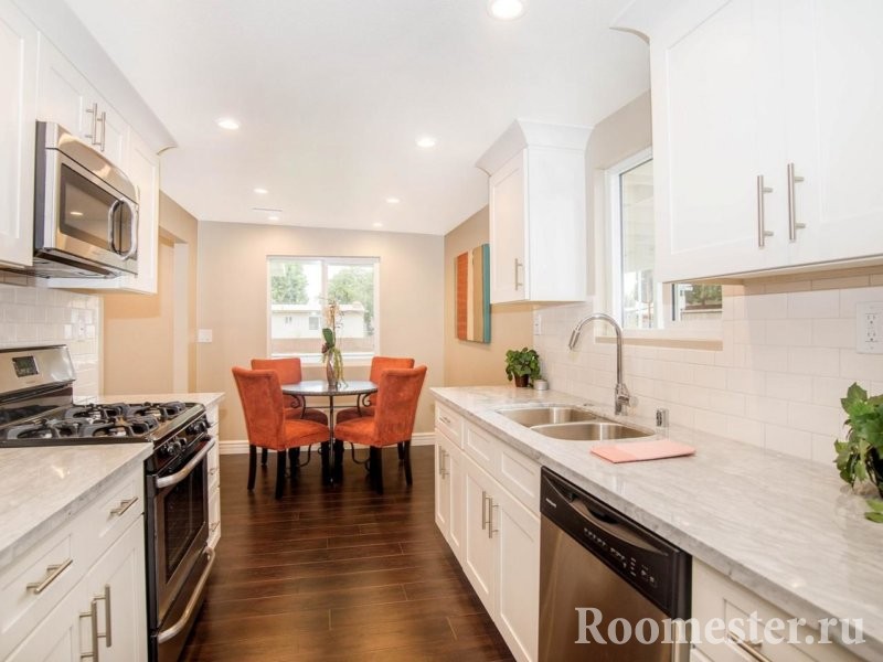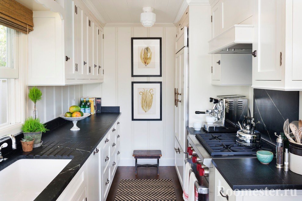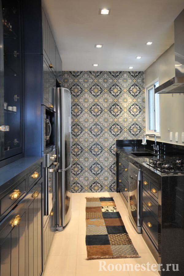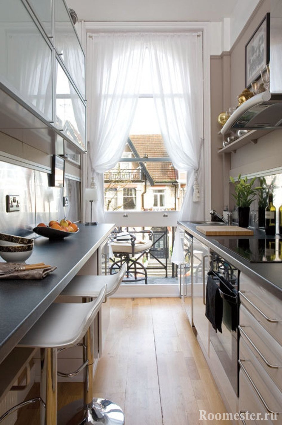 Con la puerta opuesta a la ventana al final y la longitud suficiente de la sala de la cocina, la técnica de diseño más óptima para una cocina estrecha será la división transversal del espacio en dos zonas: trabajo y comedor. El diseño de la zona de cocción es una opción paralela para colocar un juego de cocina. El pasaje dejado entre las líneas de trabajo debe permitir moverse a lo largo de la ruta "refrigerador - fregadero - estufa - encimera" durante la cocción y ser suficiente para garantizar la apertura libre de la puerta del horno, el uso conveniente de gabinetes de piso, cajones deslizantes.