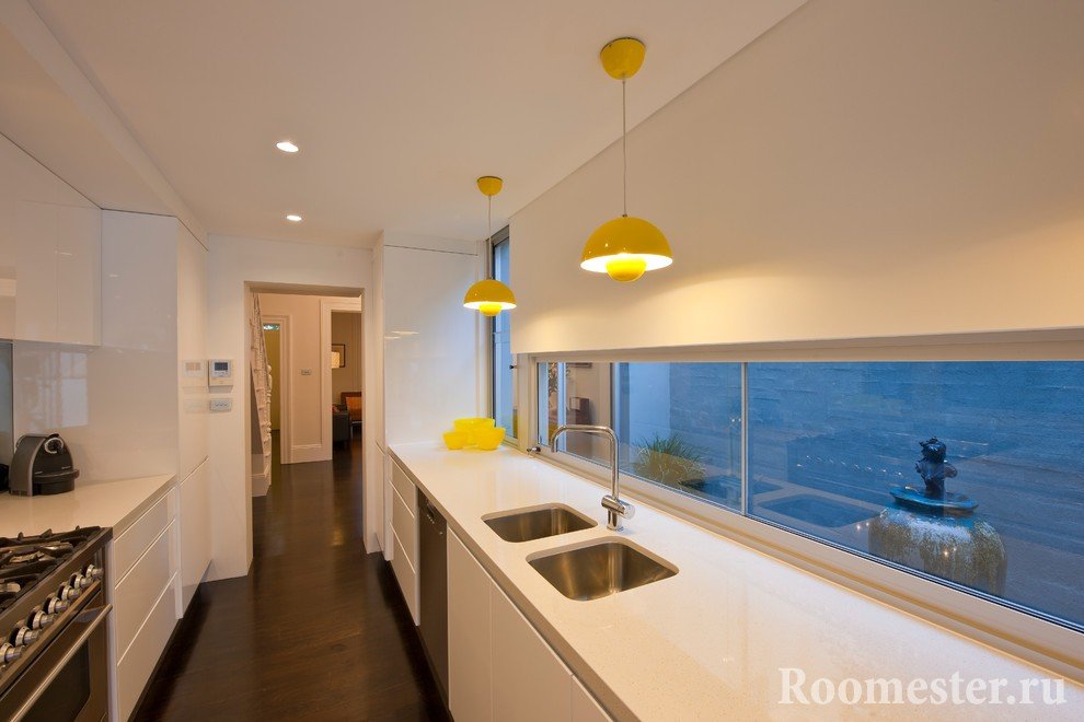 El dispositivo a lo largo de las paredes de dos líneas paralelas: una (ciega), para acomodar la cocina y el equipo necesario, y la segunda (con ventanas a lo largo de toda la pared) que se instalará debajo de la ventana de una mesa larga para bocadillos (la opción implica un comedor separado).