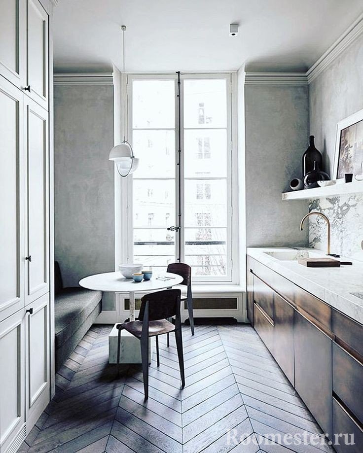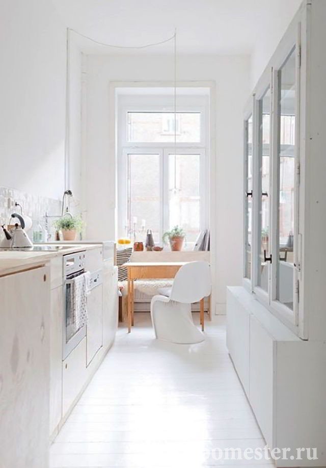 Si la abertura de la ventana atraviesa la parte superior de la pared (la tercera versión del diseño), el espacio debajo de este puede ser ocupado por la encimera, cortando un fregadero, una placa y coloque un refrigerador bajo debajo. El área del comedor debe tener una esquina opaca, que proporcione buena iluminación local, y colgarse en la pared opuesta a los gabinetes de cocina con ventana de poca profundidad hasta el techo, después de haber dispuesto un lugar voluminoso para almacenar utensilios de cocina.
