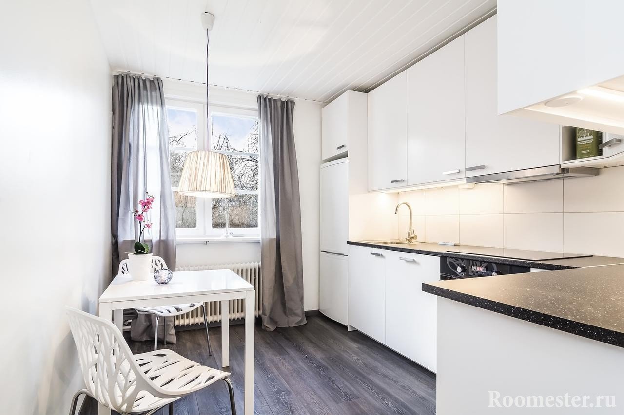 Directamente cerca de la puerta principal, es mejor usar gabinetes de piso de profundidad reducida para un movimiento conveniente alrededor de la cocina.La mesa de comedor de esta opción se puede desplegar perpendicularmente debajo de la encimera, siempre que se levante el panel que cubre el módulo de cocina inferior, o montada en una mesa de pared plegable en la pared opuesta. El grupo de comedor móvil se complementa con cómodas sillas plegables.