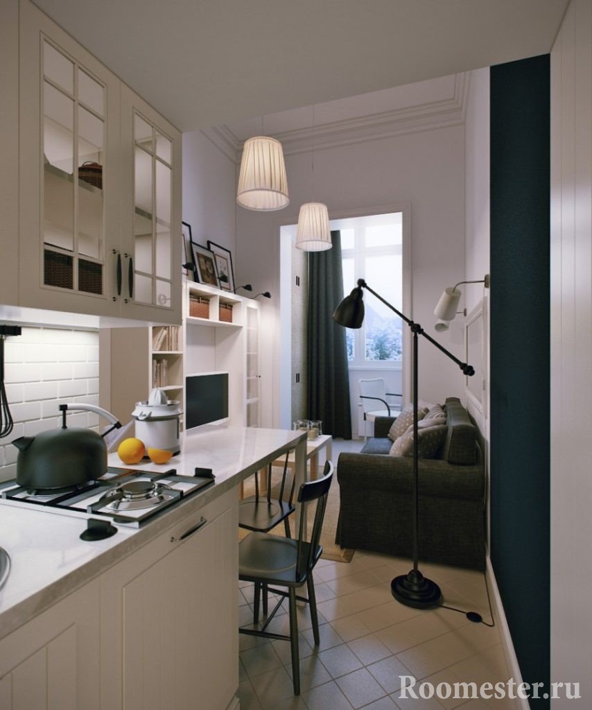 Si la familia tuviera a su disposición un cuarto de cocina que no podría llamarse cerca de la plaza, pero más fácil de caracterizar como largo y alargado, entonces, durante la reparación, se hace necesario desarrollar un diseño de cocina angosta para que sea conveniente que la persona responsable de cocinar trabaje allí, y el resto se reúna en la mesa y reciba El placer de la comunicación. Al diseñar, debe tener en cuenta todas las normas de ergonomía, prever la ubicación de los electrodomésticos, gabinetes, superficies de trabajo necesarios y utilizar las herramientas de diseño para expandir el espacio y armonizarlo.