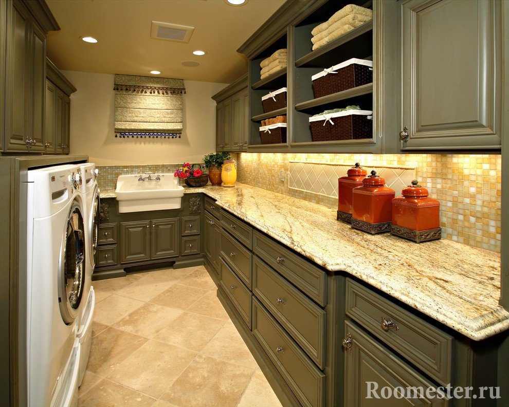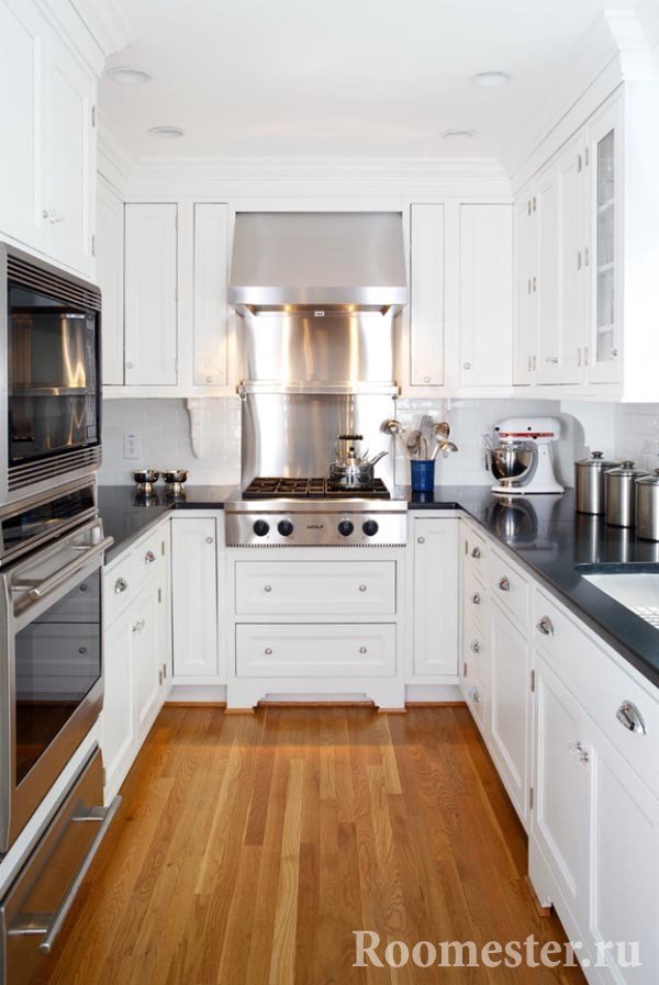 los electrodomésticos de formato completo llenan el extremo de la cocina o van a lo largo de una de las paredes (se prefiere la forma de L de organizar los muebles).