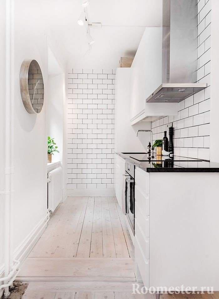 Al elegir un esquema de color para un espacio pequeño y alargado, uno debe adherirse al axioma "blanco - se expande, oscuro - reduce". La naturaleza monocromática de la cocina no lo hace aburrido, puede agregar humor al incluir varios acentos brillantes, lo principal es observar la medida y la regla del laconismo: "Si puedes prescindir de algo, es mejor prescindir de él".