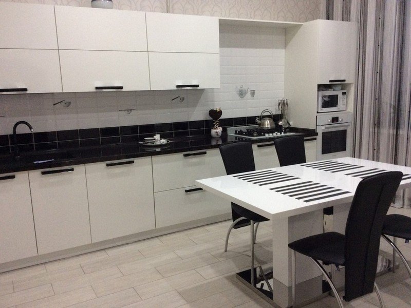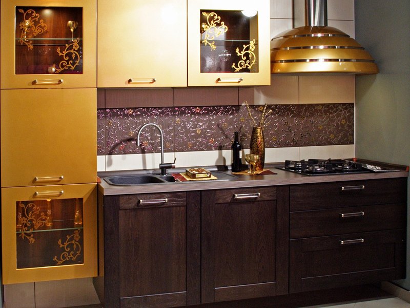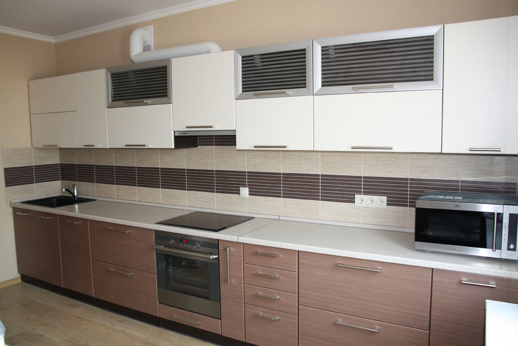 La forma lineal de imponer la ejecución no difiere del estándar. En este caso, el dúo otorga más importancia al dúo de la textura y el color de la baldosa. Se combinan en varias combinaciones, pero con una regla: las líneas se forman del mismo tipo de mosaico. Esta opción es adecuada para cocinas estrechas con delantales pequeños.Las líneas horizontales extienden visualmente todo el espacio.