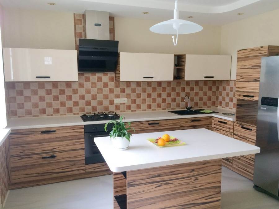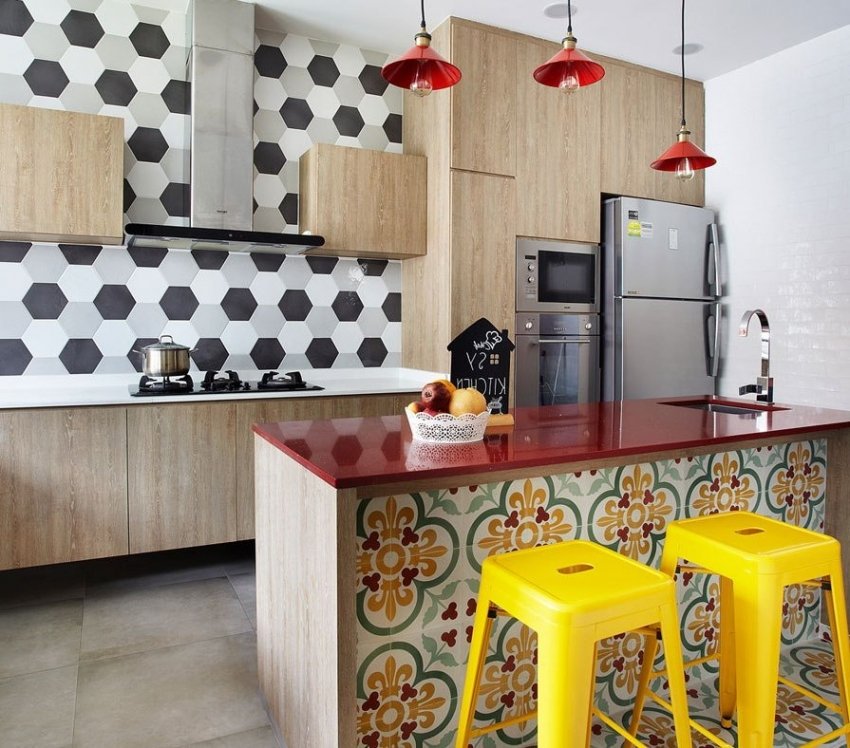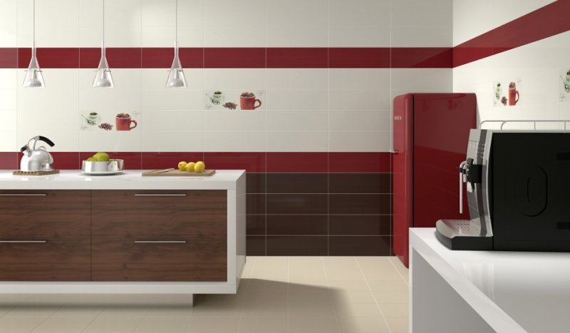 En cuanto al diseño del azulejo, el azulejo cuadrado liso ha estado compitiendo durante mucho tiempo con cerámicas de configuraciones y colores inusuales. En los interiores modernos, se encuentran cada vez más módulos de formas rectangulares debajo de un ladrillo (jabalí), "panales" hexagonales e incluso cuadrados y triángulos con bordes ondulados (una excelente adición para el art nouveau). Este último se puede encontrar en las colecciones de materiales de acabado del autor. La gama de colores también agrada a los clientes con su variedad. Los fabricantes de baldosas cerámicas también han adoptado el moderno efecto ombre. Elementos con gradación de color, donde los tonos se seleccionan de acuerdo con el principio de analogía de oscuro a claro, una nota extraordinaria se derramará en el interior de la cocina.Adornos florales, patrones ornamentales, geometría compleja, paisajes enteros y panoramas: el rango de variaciones en el diseño de la portada es realmente enorme.