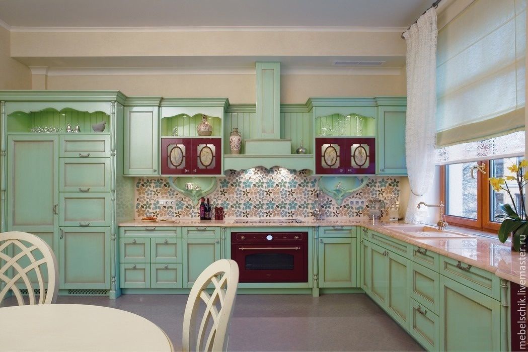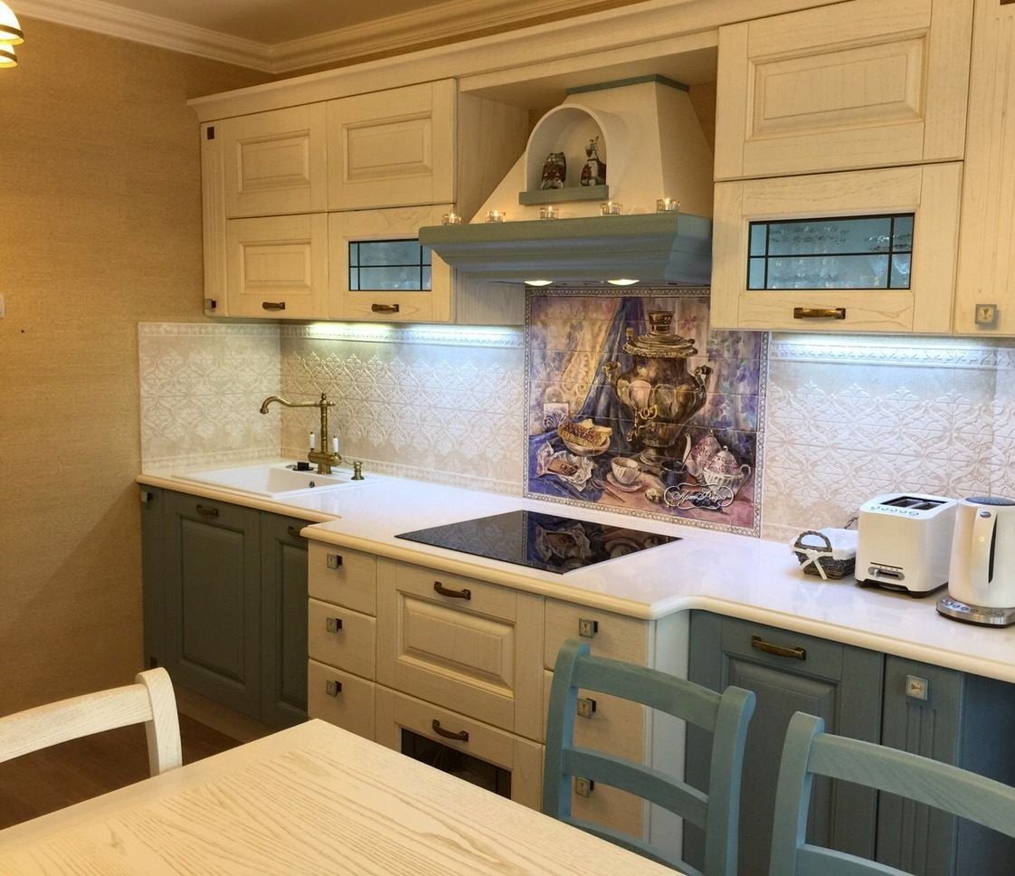 Para las cocinas clásicas, los tonos más sobrios son más adecuados: beige, crema, blanco, burdeos, café. Además, el clásico acepta un diseño de mármol. Las baldosas en un delantal de cocina pueden superponerse con material de encimera o revestimiento de piso. En la dirección escandinava de moda, se utilizan tonos azules, turquesas, verdes y azules. Los interiores de estilo provenzal (subespecie del país) combinan azulejos estampados y lisos para crear una atmósfera rústica ligera de facilidad y simplicidad. Para art deco (moderno), es adecuado un mosaico de negro, gris, morado, azul. El delantal para la cocina en el estilo loft está terminado con baldosas de cerámica "debajo del ladrillo" de tonos rojos, marrones, blancos y cerezos. Un azulejo es adecuado para los mismos interiores, cuya superficie imita la textura de la madera. En el eclecticismo, un delantal de cocina generalmente se convierte en un área de acento. Por lo tanto, para su diseño, se utilizan azulejos de tonos brillantes: amarillo, verde, rosa. Para cocinas modernas de alta tecnología, un revestimiento plateado y espejo, azulejos negros brillantes son adecuados.Los interiores étnicos marroquíes están decorados con azulejos coloridos con un patrón complejo. El método de colocación en mosaico también es adecuado para ellos, donde el mosaico multicolor se alterna con el liso (lila, azul, amarillo). El esquema de color del estilo marino está limitado por tonos de marrón y amarillo (simula arena) y azul (océano, mar). Para el minimalismo, se selecciona una combinación de tonos oscuros y claros. Por ejemplo, blanco y acento púrpura, turquesa, verde, terracota.