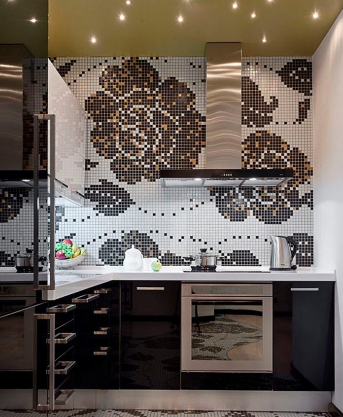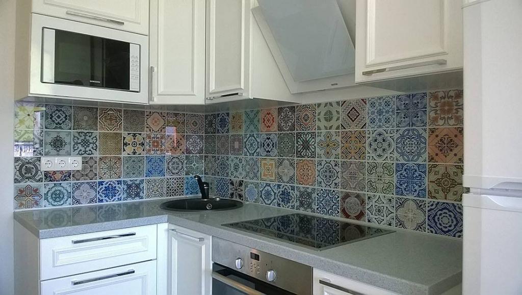 Para decorar un delantal, generalmente se elige un mosaico estándar de 10x10 cm. Las opciones más grandes son ligeramente menos comunes: