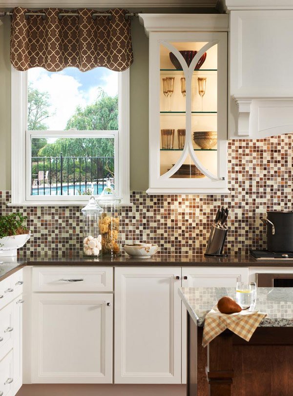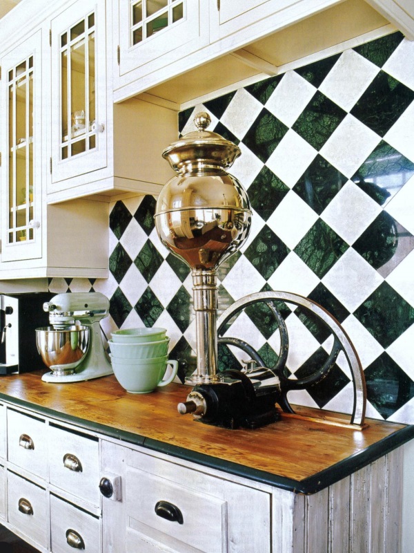Esta forma de colocación obtuvo su nombre debido a la similitud del delantal con un tablero de ajedrez. Como regla general, se utilizan mosaicos de dos colores. Si el delantal se convierte en un acento, se seleccionan dos tonos contrastantes. Las baldosas se colocan de forma estándar o diagonal. Sin embargo, cada mosaico del mismo color debe estar rodeado de mosaicos de un tono diferente. A veces, se agregan insertos del tercero o fragmentos con un adorno en dos tonos para revitalizar la superficie y hacerla más frívola. Esta opción es adecuada para estilo country.