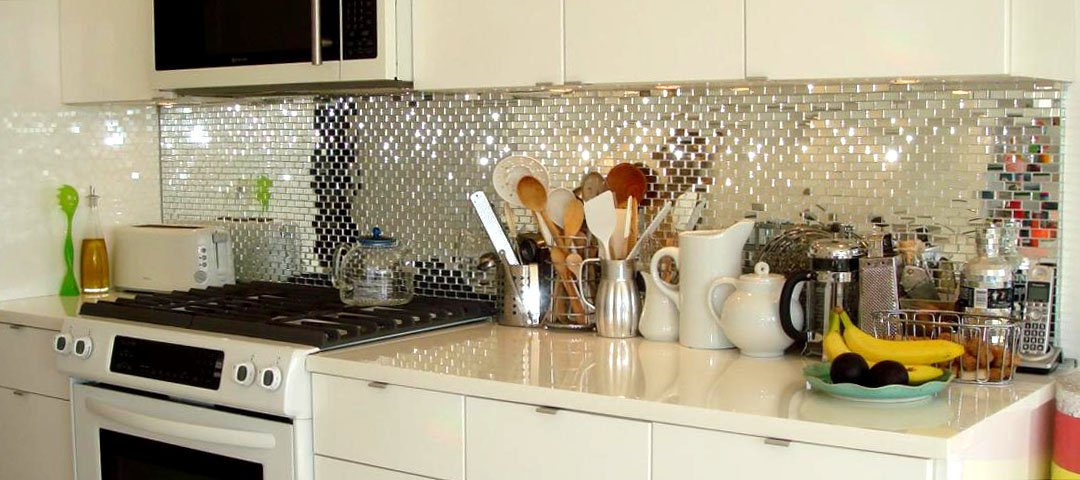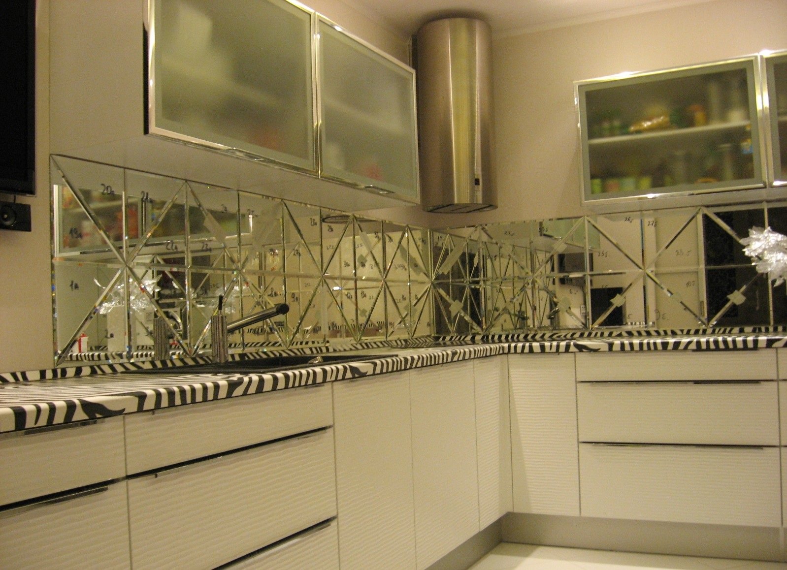 Delantal de azulejos de espejo: una lujosa solución decorativa para cocinas elegantes. El material es vidrio templado. Es ligeramente inferior a la cerámica en cuanto a resistencia, pero la diferencia es mínima. Debido a la superficie reflectante, puede agrandar visualmente la habitación. El azulejo en forma de rombos recuerda un poco a una regla de carro y es adecuado no solo para los clásicos, sino también para el caprichoso estilo de palacio. La principal desventaja de dicha superficie es su suciedad. Cualquier fuga de agua, huellas dactilares o gotas de grasa salpicada deben limpiarse inmediatamente del azulejo, de lo contrario se verá descuidado. La superficie del espejo no se puede limpiar con productos abrasivos.