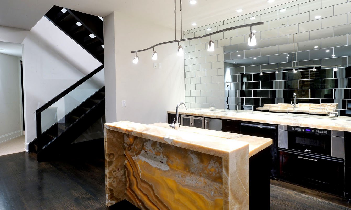 La colocación con desplazamiento se ve bien en una baldosa rectangular. Se pueden ver ejemplos de este método en las paredes de los edificios de ladrillo. Cada fila posterior se desplaza la mitad del ancho del "jabalí". Resulta que la unión entre las fichas se encuentra exactamente en el medio de la ficha de la fila anterior. Esta opción se adapta a los estilos de loft, alta tecnología, fusión.Se ve muy bien con el offset en el espejo y las baldosas de metal. En términos de ahorro de material y practicidad, este método está a la par con el estándar y la diagonal.