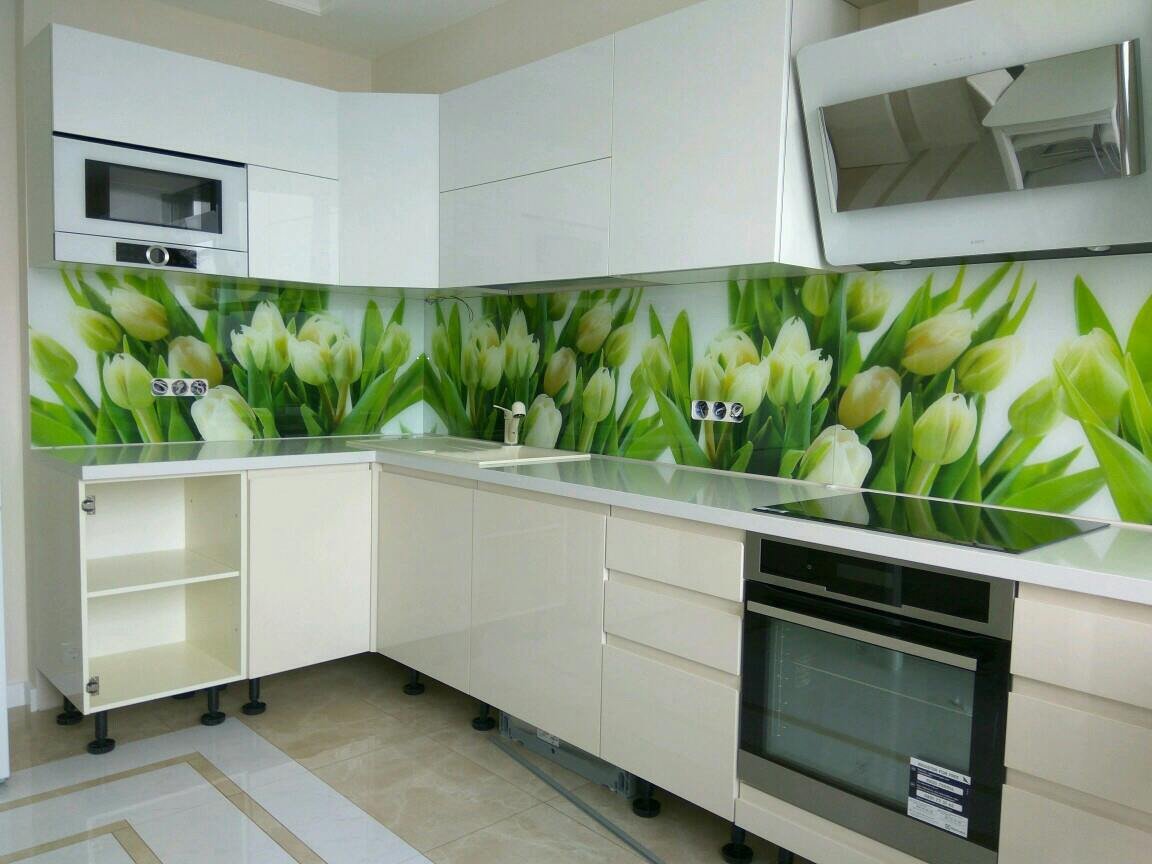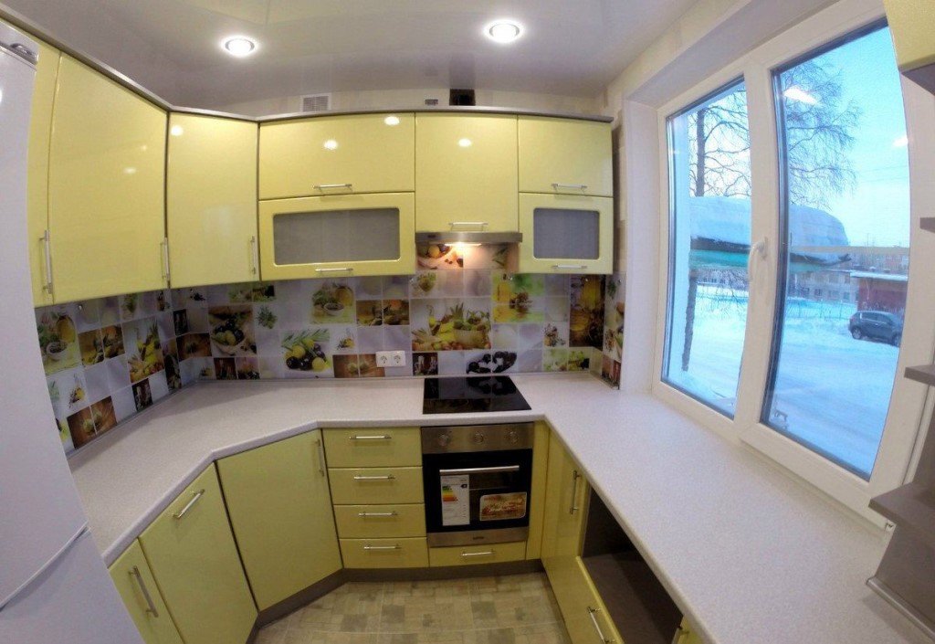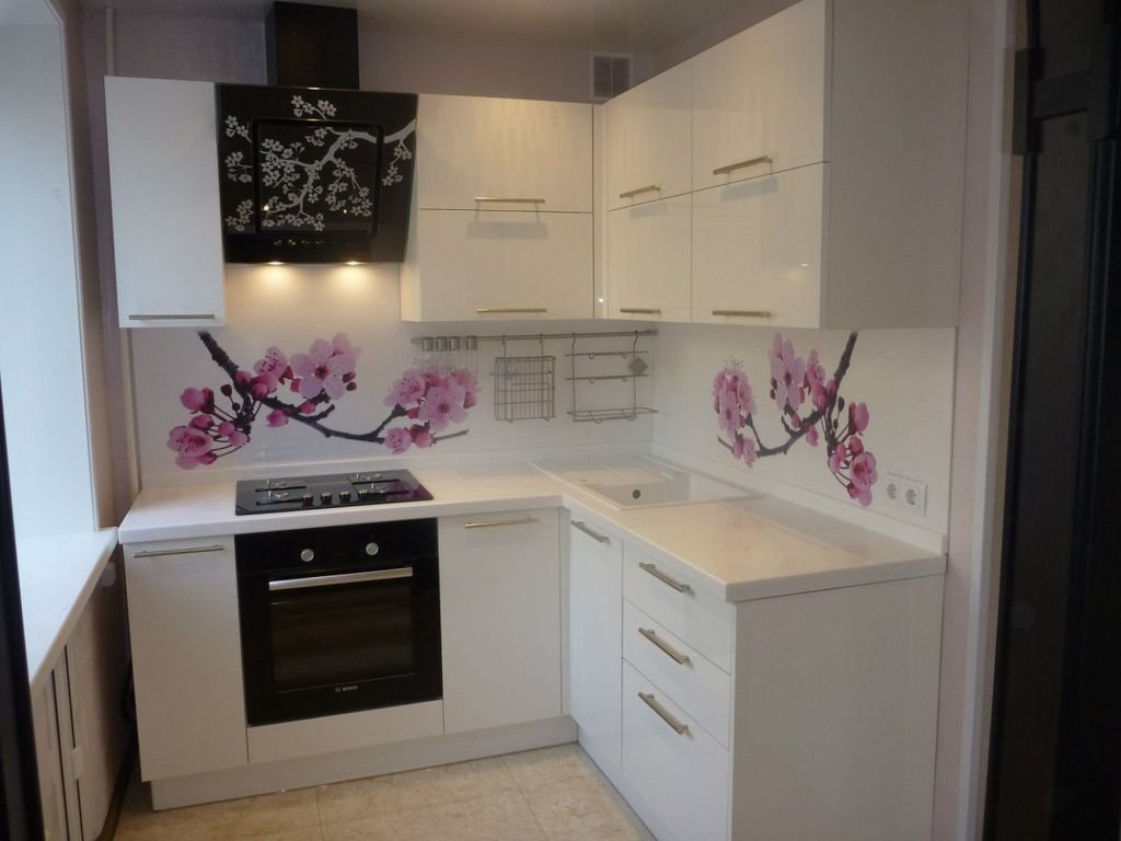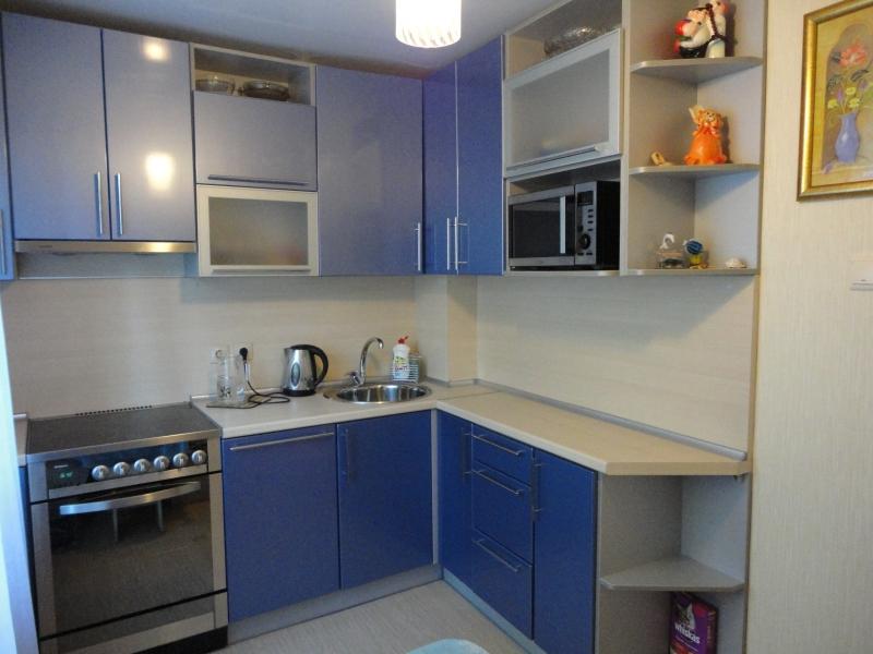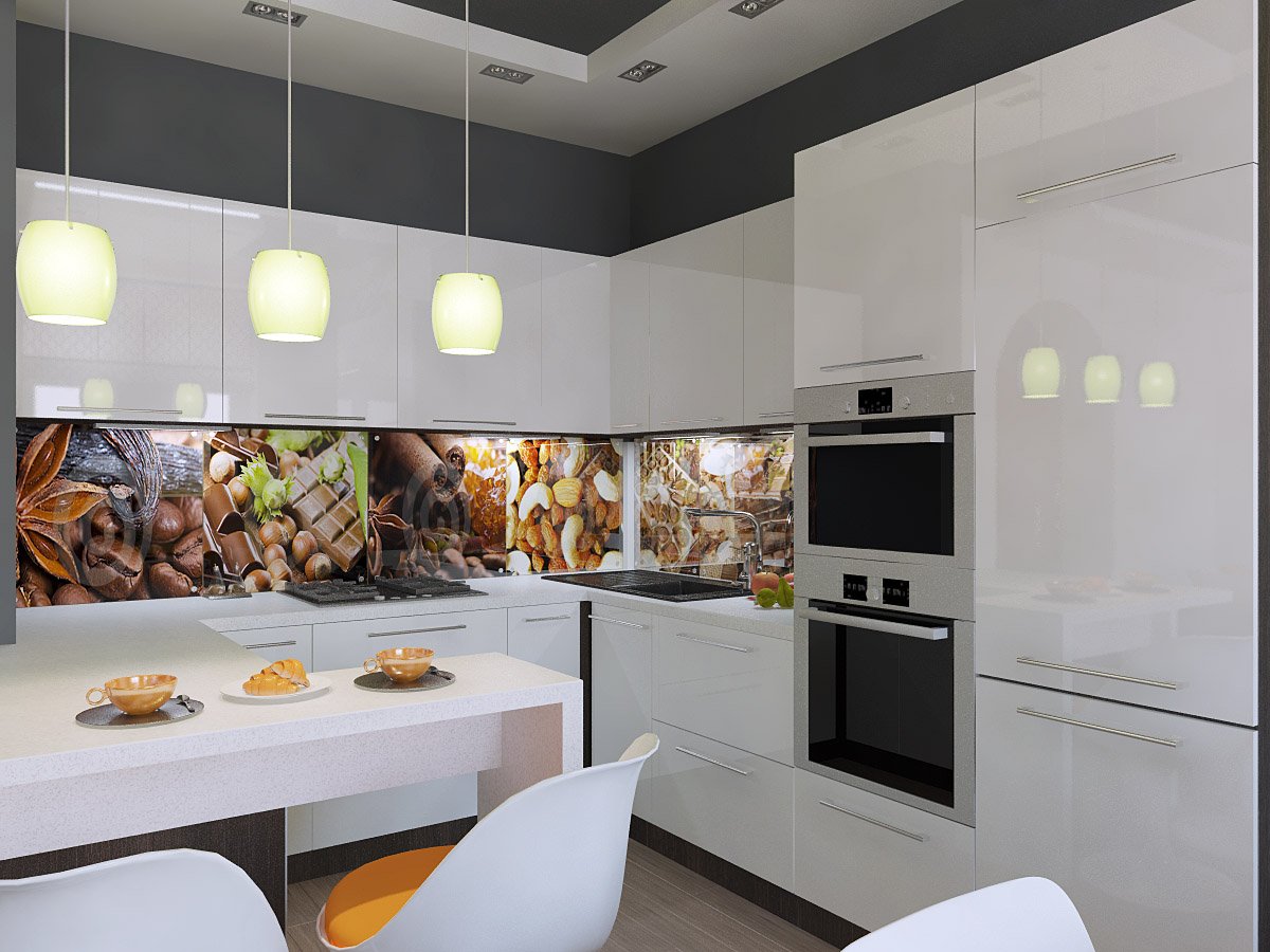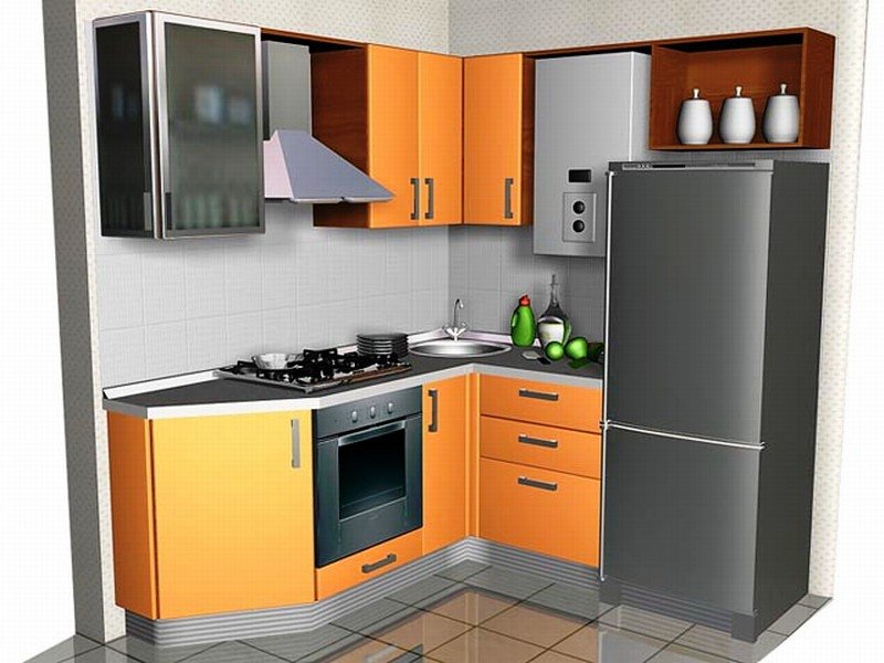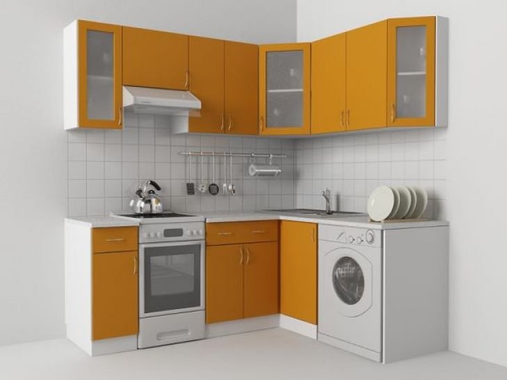 En habitaciones estrechas, este diseño no será posible, por lo que puede ser óptimo en habitaciones con aproximadamente el mismo largo y ancho, como es el caso de la cocina en Jruschov. Esta configuración es necesaria para aquellos que necesitan un triángulo de trabajo compacto. El conjunto y los electrodomésticos se colocan a lo largo de dos paredes adyacentes, y en la esquina habrá un elemento de forma curva: cajas de esquina, espacio para un contenedor, un fregadero o alguna opción de combinación. La mesa se coloca en la esquina opuesta. El pasaje será gratuito: esta es una de las principales ventajas del diseño angular. No se olvide de ahorrar espacio en las esquinas y facilidad de uso. En la esquina hay un lugar para muebles profundos y espaciosos. La desventaja es que no es tan fácil encontrar una fachada que sea ideal para una habitación de esquina, y a veces hay que hacer un pedido especial y dedicar tiempo a los trabajos preparatorios.