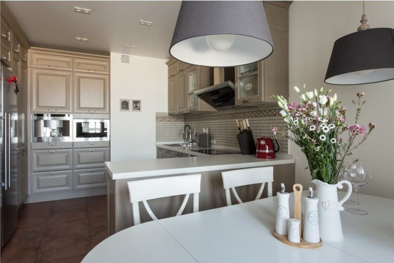 Un juego de cocina en forma de letra "P" generalmente consta de tres paredes, pero en algunos casos uno de los lados es una barra o península. La sala de cocina del "apartamento de Khrushchev" es adecuada para colocar un conjunto en forma de U, y se puede hacer tanto por separado como integral. En el segundo caso, deberá asignar un lugar cerca de la ventana: habrá un lavabo y otras secciones bajas. Es necesario que el alféizar de la ventana tenga una altura en el rango de 85 a 90 cm. El ancho del pasaje entre los lados opuestos es idealmente de 1.4 a 1.6 metros. En la cocina, todo estará ubicado muy cerca uno del otro. Gracias a esto, se adaptará bien para cocinar. Si se reconstruye el apartamento y se retira la pared entre la cocina y la sala de estar, entonces será posible usar un pasaje adicional y aparecerá un área de cocina conveniente en el espacio del apartamento.
