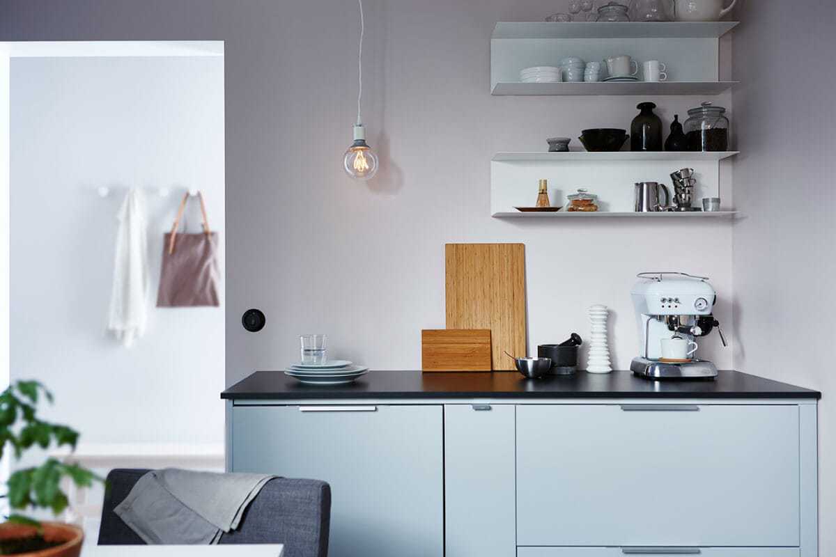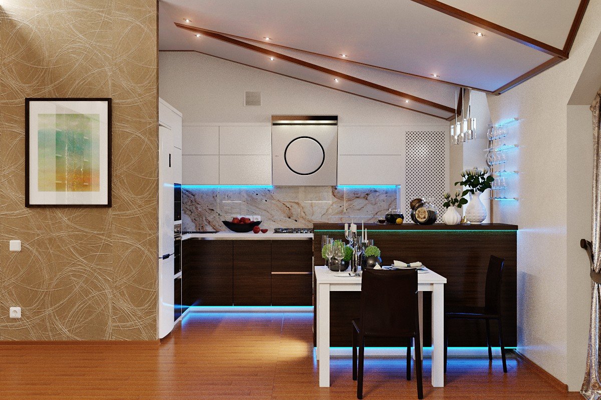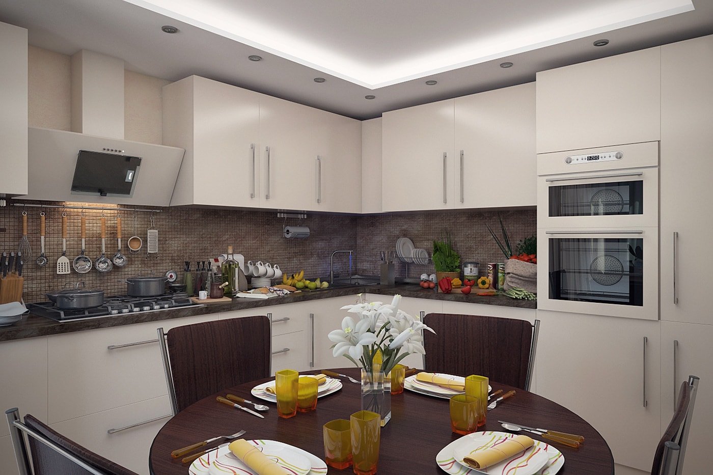 En la cocina, es necesario contar con fuentes de iluminación adicionales para poder encender luces brillantes o tenues. Se requiere una iluminación ligera principalmente para facilitar el proceso de cocción; se puede usar en cualquier momento del día. Los focos pequeños son una opción ideal para una cocina, especialmente una pequeña. En primer lugar, están destinados a iluminar la superficie de trabajo y la mesa de comedor. Los focos se instalan en una línea recta. Si lo desea, se monta un pequeño dispositivo de iluminación dentro de una de las paredes para cambiar el énfasis de la iluminación. No se recomienda instalar candelabros de gran tamaño en el techo; la opción ideal es una lámpara plana ancha con techo cerrado. Si es posible diseñar la iluminación principal, entonces debe colocarse en el centro del cuadrilátero que bordea la cocina.