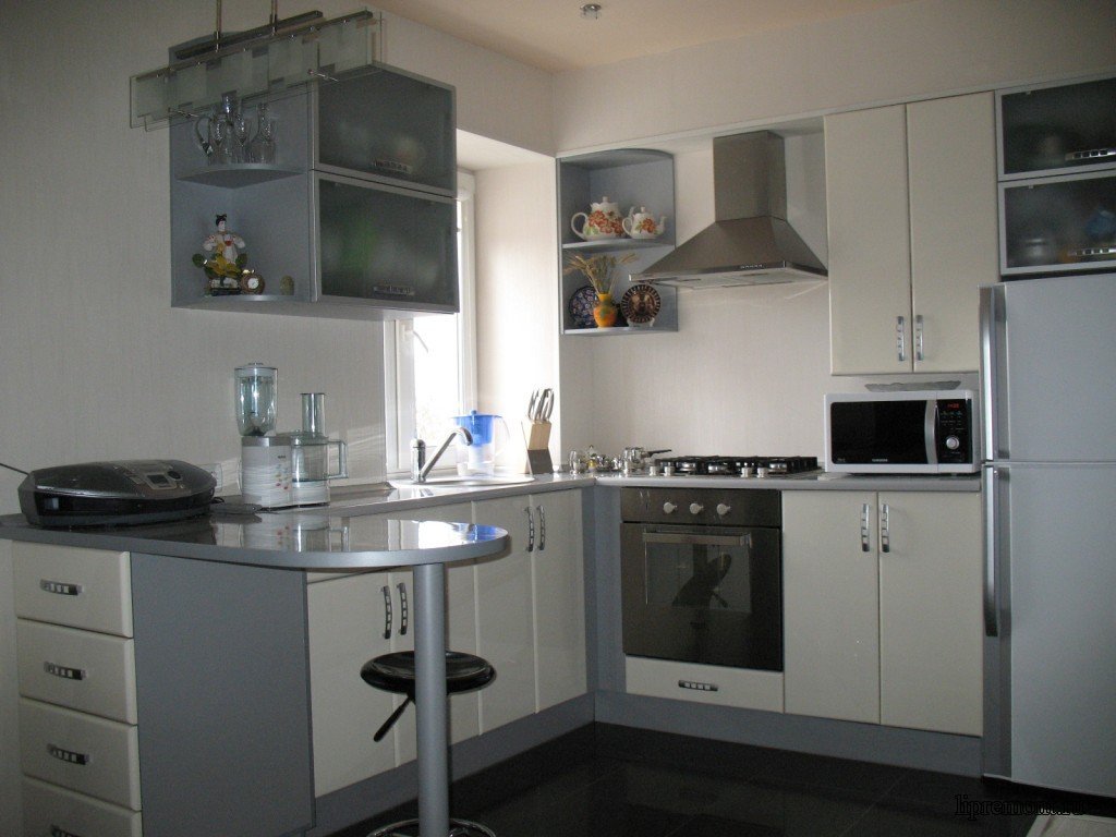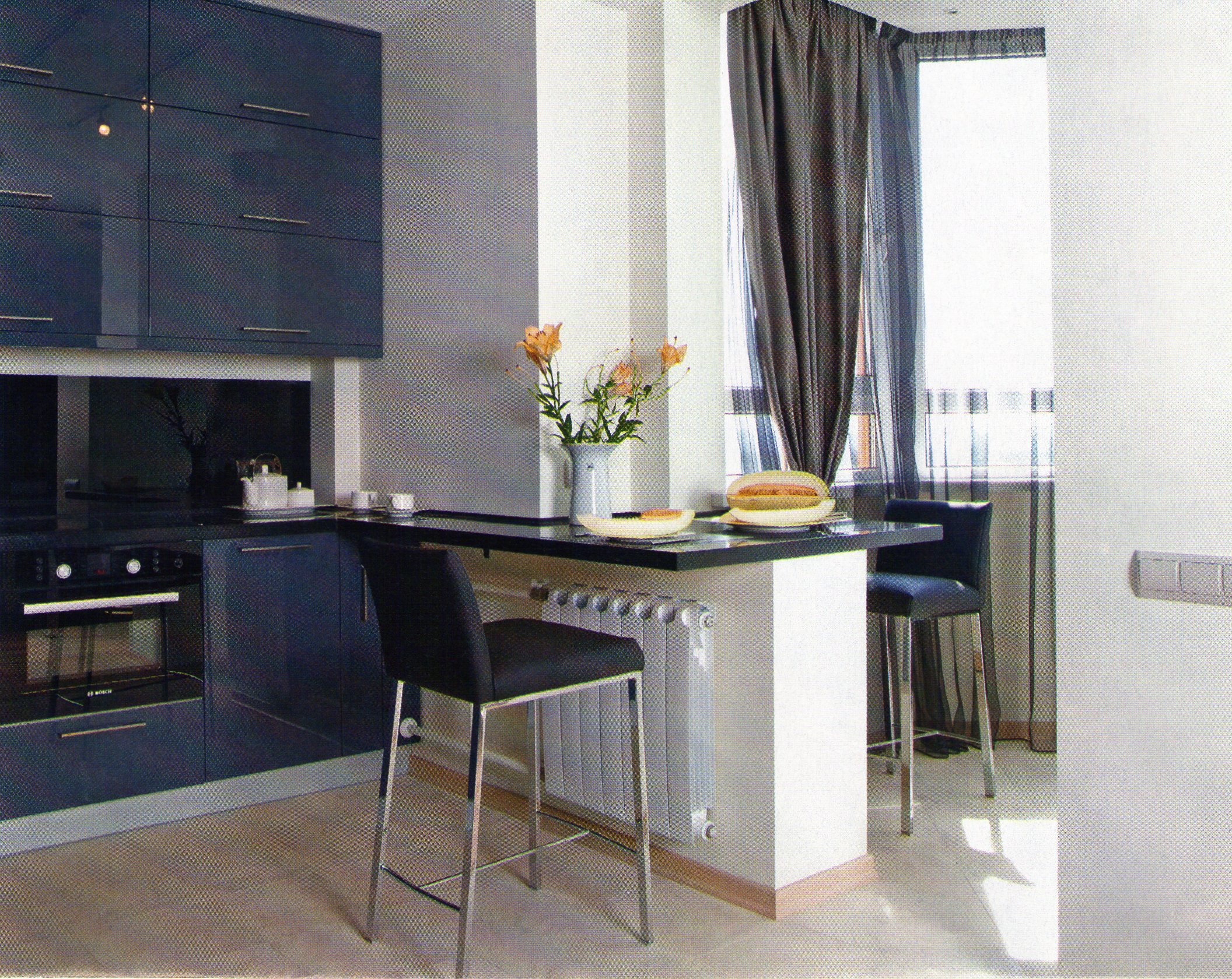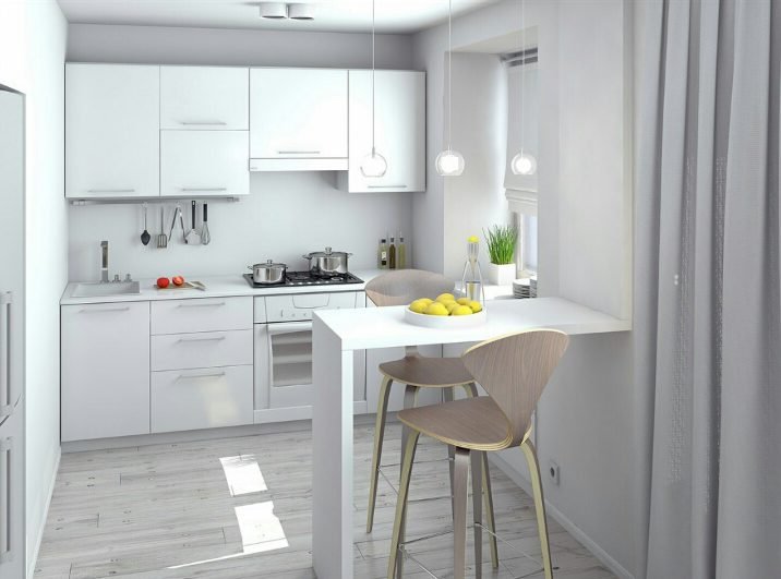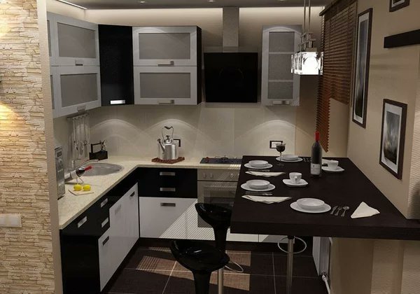La prioridad es ahorrar espacio. A este respecto, un elemento como una barra de bar es útil: reemplazará la mesa del comedor y estará lo más cerca posible del auricular. Los taburetes de bar estrechos también ahorrarán espacio. Si necesita una tabla regular, es mejor dar preferencia a los modelos rectangulares. No se recomienda comprar mesas redondas. Otro elemento importante, el refrigerador, no debe dividir los lados a intervalos iguales. Lo pusieron en la esquina, pero a excepción de aquellos casos en los que debido a esto se requiere bloquear la ventana. La columna de gas generalmente está enmascarada detrás de la fachada.
