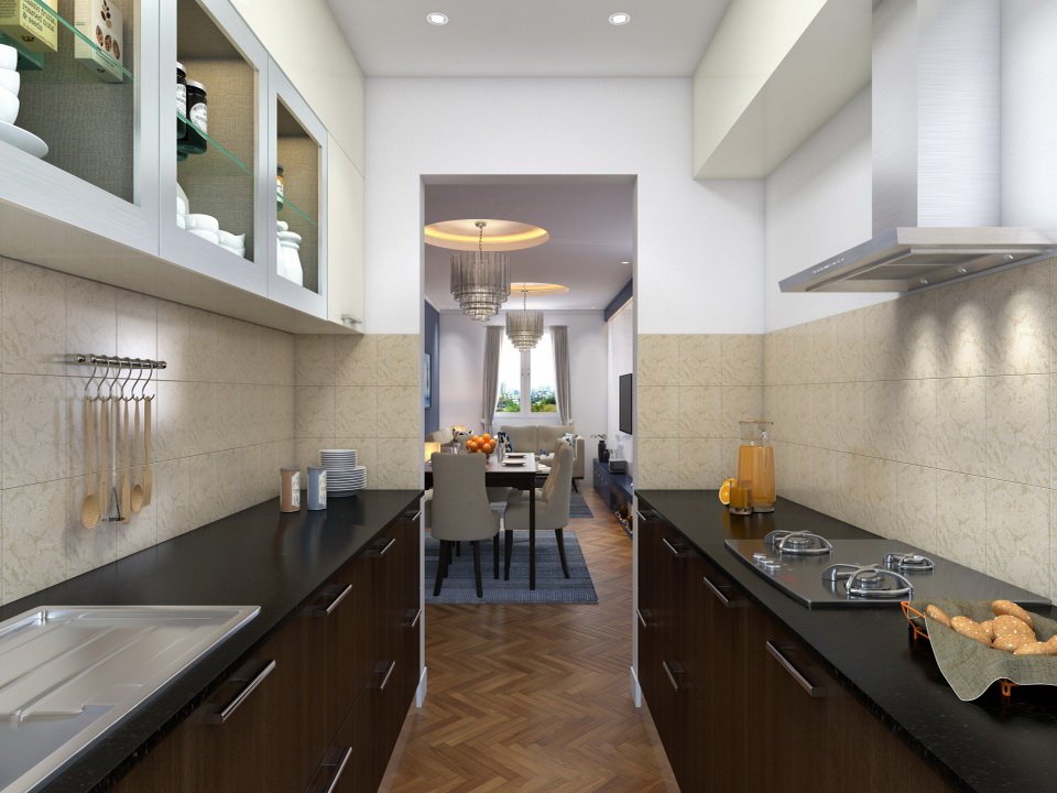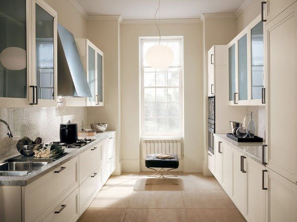 La versión de dos líneas es menos popular que las otras: angular, lineal en una fila y otras. La configuración de dos filas proporciona la disposición de elementos de muebles y electrodomésticos uno frente al otro. Un auricular se acorta para que no haya sensación de hacinamiento. La distancia mínima permitida entre las filas es de 1 metro, la óptima es de 1,5 metros. Una cocina de configuración paralela puede ser de dos tipos: un recorrido y un recorrido. En el primer caso, sirve como una sala de conexión, y en el segundo termina con una pared con una ventana,salida al balcón o una superficie opaca. Un diseño de dos filas no será apropiado en habitaciones estrechas y muy anchas. Si la cocina necesita una fachada de muebles adicional, entonces no hay otra opción que crear otra fila. Las principales ventajas de este diseño se expresan en una gran área de la superficie de trabajo y una variedad en la elección de un lugar para almacenar alimentos.