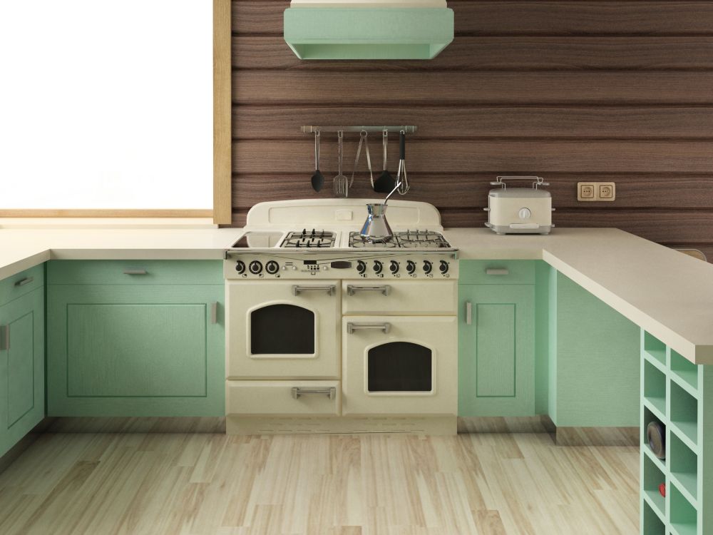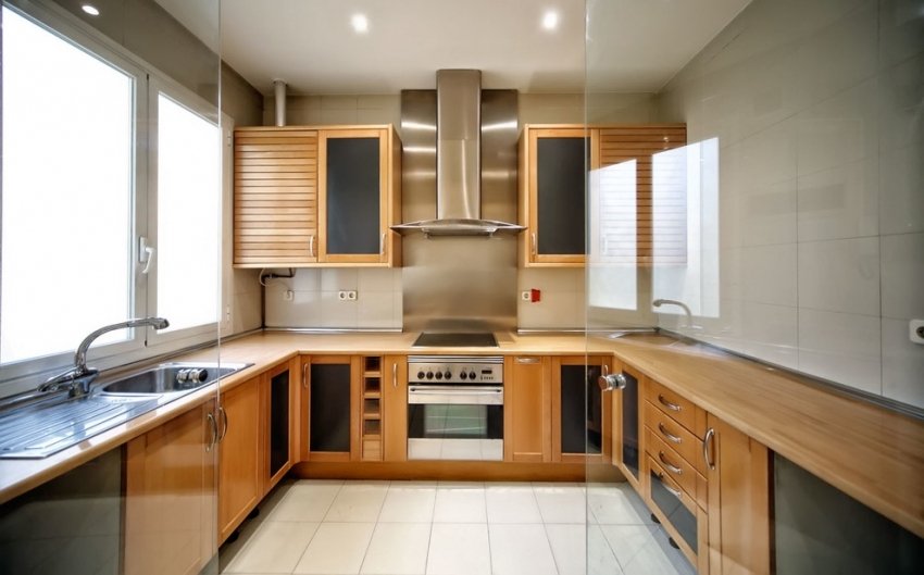 Una campana extractora, refrigerador y estufa de gas se encuentran lejos de ella. Los nichos en las paredes incluyen un microondas y un pequeño horno separado. La campana se coloca exactamente encima de la estufa. La lavadora se instala al lado del fregadero, pero si existe esa oportunidad, es mejor no usarla en la cocina. En este lugar, es mejor instalar un lavavajillas.