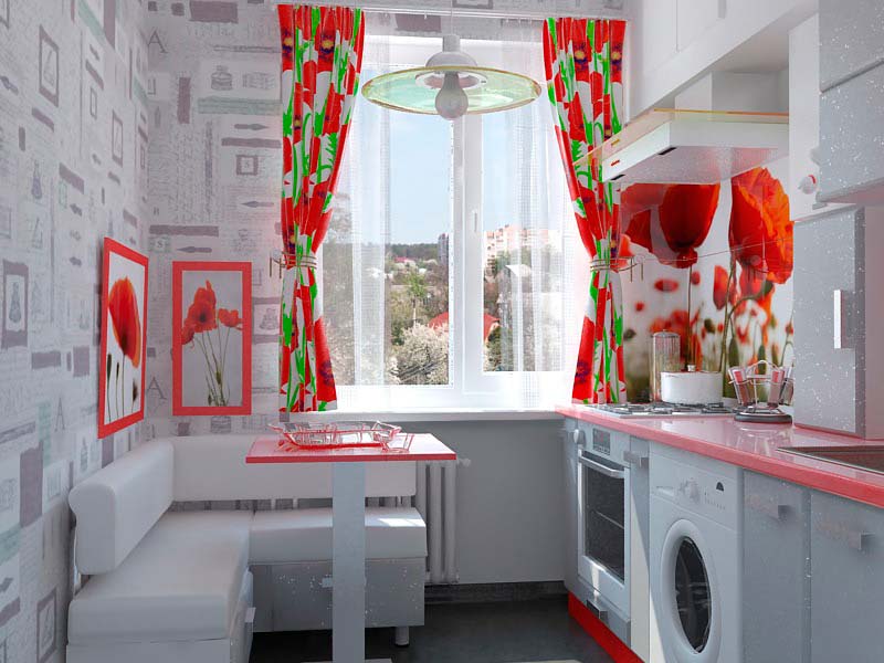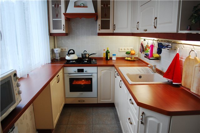 La mayoría de los Khrushchevs en la cocina tienen un géiser. Es habitual ocultar este elemento detrás de los muebles, ya que parece impresentable. La iluminación natural en Jruschov es estándar: las ventanas de las habitaciones son bastante amplias.