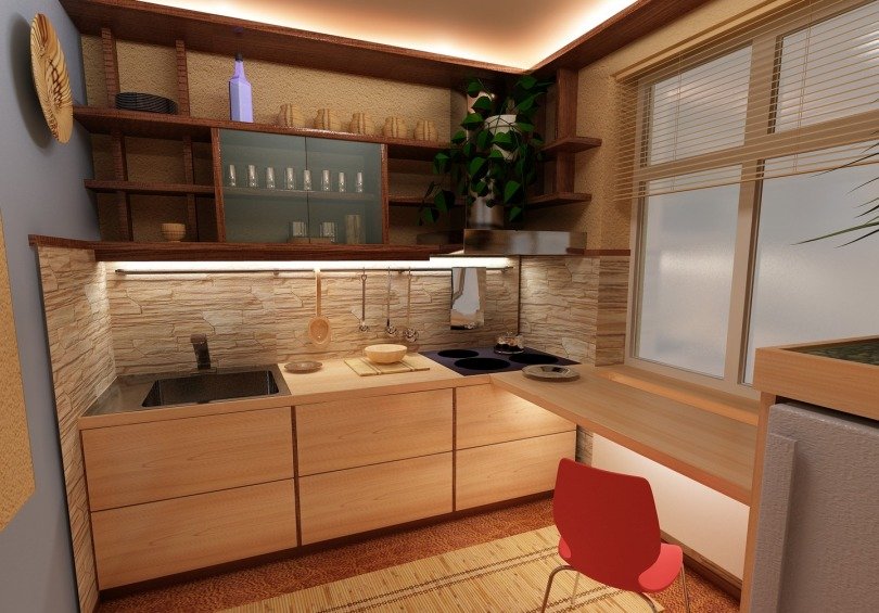 La cocina en Jruschov es una habitación compacta de forma rectangular o cuadrada. Tiene un ancho mayor que el de la cocina en Brezhnevka, sin embargo, el área total deja pocas opciones para colocar varios accesorios. Tiene aproximadamente seis metros cuadrados. Los cambios en el diseño de esta sala deben tratarse con precaución para no dañar la organización del espacio. No es fácil aumentar el tamaño de la cocina, porque en este caso necesitará una remodelación con el desmantelamiento de la pared y la unificación de la cocina y la sala de estar (pasillo, despensa, etc.). Si la pared está soportando, entonces debe buscar otra solución.