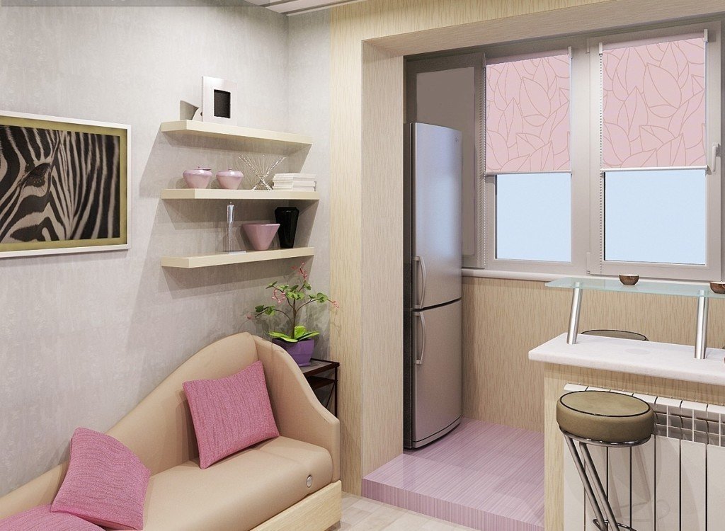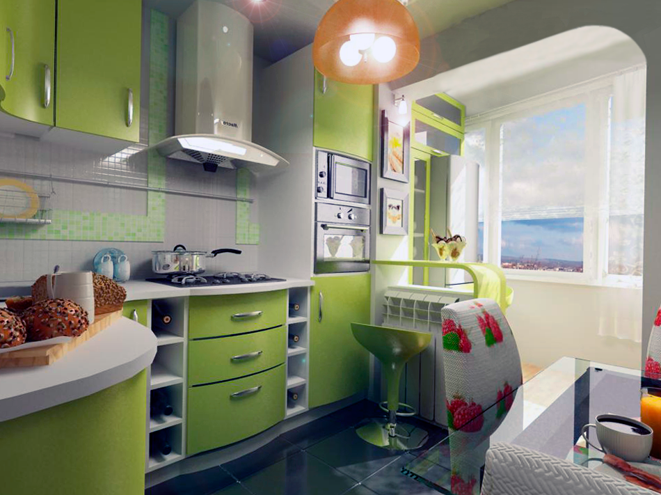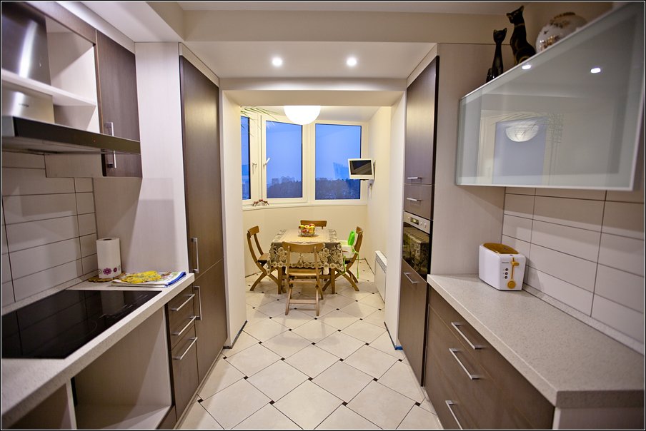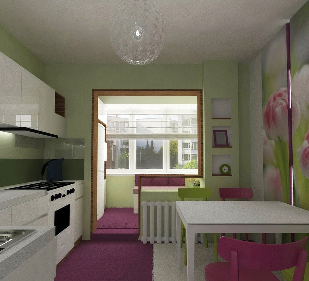 Si hay acceso al balcón, esto se puede usar para expandir el espacio. Como resultado de eliminar la pared entre estas habitaciones, el tamaño de la cocina aumentará ligeramente. Esto permitirá organizar un nuevo lugar para almacenar utensilios de cocina; cambiar la disposición de los módulos de muebles. La cocina se volverá mucho más brillante.