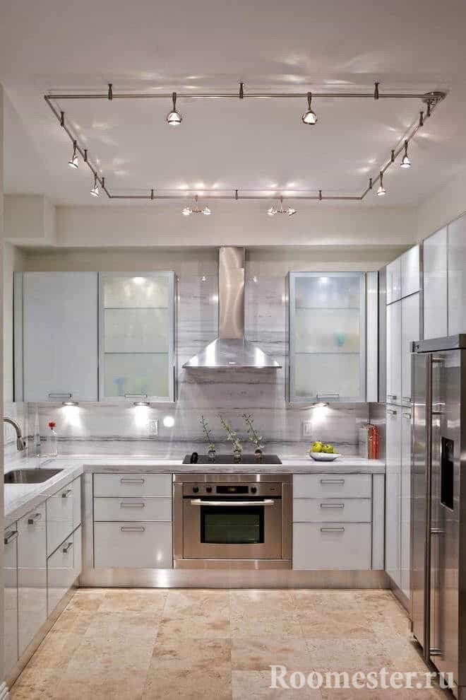 Una etapa muy importante en la formación del estilo de alta tecnología es la organización adecuada de la iluminación en la cocina. Candelabros clásicos, apliques no funcionarán aquí.