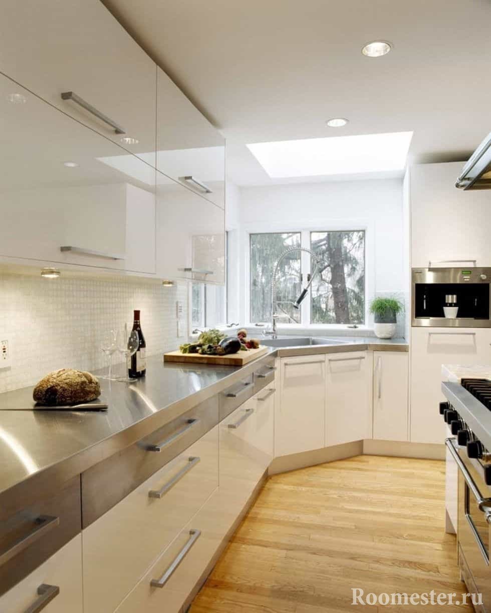 La cocina no acepta el desorden. Por lo general, todas las superficies y paredes están libres de rieles del techo y pequeños utensilios de cocina, así como otros artículos para el hogar, productos químicos para el hogar y otras cosas.