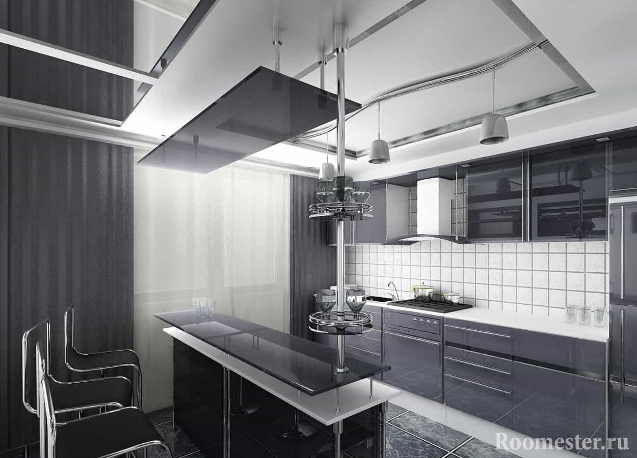 La opción más común es un techo suspendido suspendido. El principal punto negativo de esta opción es que es necesario sacrificar unos centímetros de altura. Esto puede ser un inconveniente significativo cuando se trata de una pequeña área de cocina.