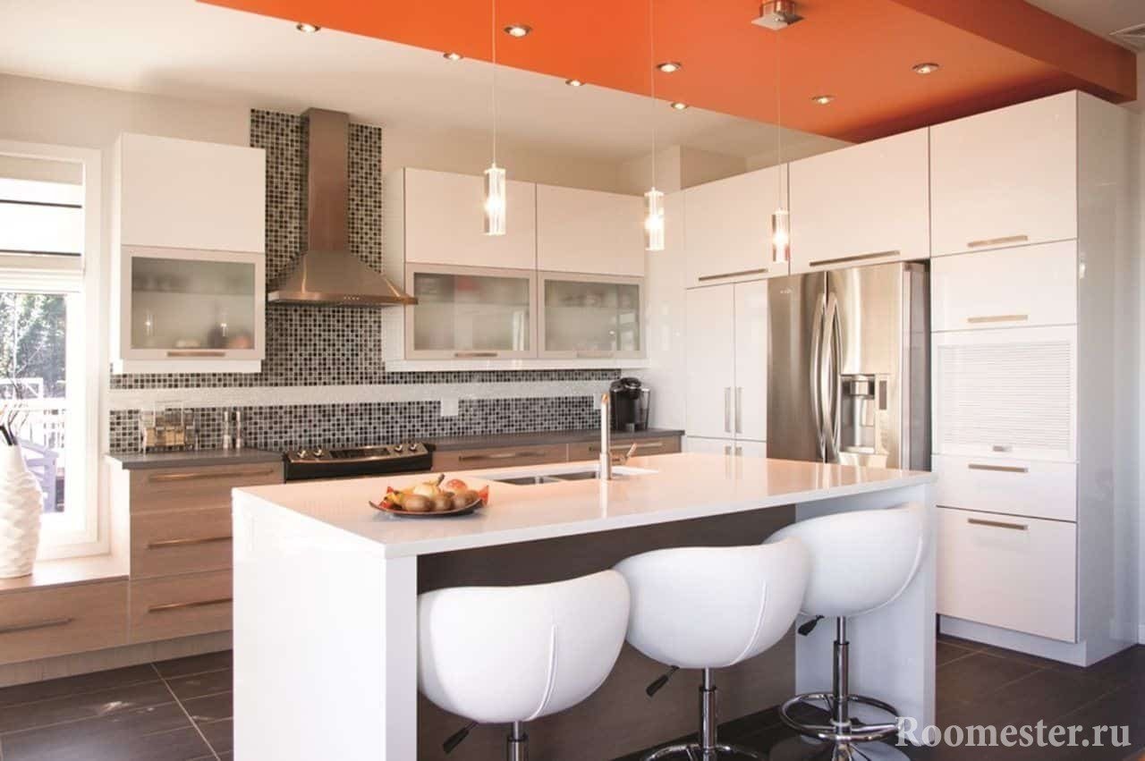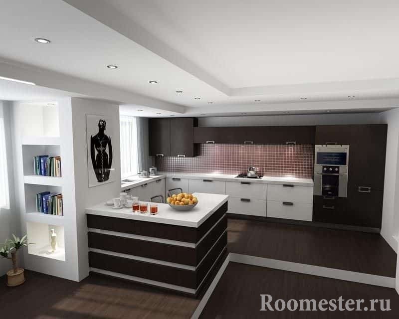 Una excelente solución para la cocina es un diseño de varios niveles con abundante iluminación. Además de la función principal, puede servir como un separador de espacio si se proporcionan varias zonas.