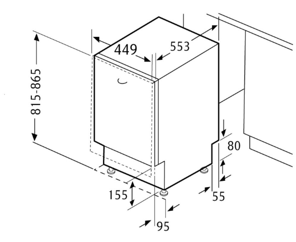 La base de los cálculos es la medición del sitio de instalación. Deberá medir la altura, el ancho y la profundidad del gabinete, gabinete o nicho. Debe elegir en función de estos parámetros con la deducción de unos pocos centímetros. También es recomendable comprar dispositivos con patas ajustables, incluso si se trata de un lavavajillas compacto. Cambiar la altura de las patas es una opción adicional para una ubicación conveniente en un gabinete / nicho. El espacio de instalación debe cumplir una serie de criterios. En primer lugar, estos son ángulos rectos. También se requieren orificios para el cable de alimentación, el drenaje y las mangueras de drenaje. La profundidad estándar del espacio libre debajo de la encimera del área de trabajo de la cocina es de 58 cm con un ancho de 60 cm. La altura depende de muchos factores, pero generalmente de 82 cm. Esto es suficiente para modelos de hasta 81 cm. Un gran grupo de lavavajillas tiene un indicador de altura de 60 cm. Altura Las instalaciones compactas empotradas son típicamente de 45 cm.