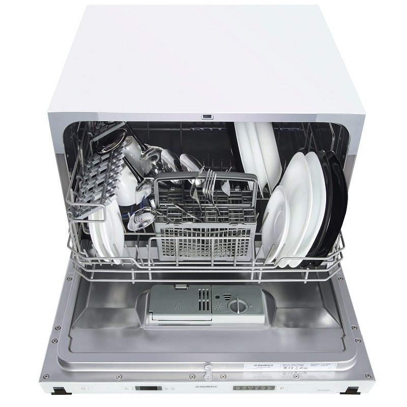 Debido a la pequeña profundidad del mini PMM, son útiles para familias pequeñas. En las opciones de mesa, por ejemplo, se colocan hasta 6 juegos de utensilios de cocina. Gracias a las características del trabajo, se permite su uso en estanterías, incluso dentro de las secciones de muebles con bisagras. Los dispositivos más extendidos con una altura de 45 cm. Los PMM más pequeños se parecen a los hornos de microondas. Los programas de lavavajillas compactos proporcionan el modo de remojo previo, delicado, estándar y rápido. Para la correcta conexión de modelos compactos, es suficiente familiarizarse con una breve instrucción. Hay algunas desventajas. Para familias numerosas, lo más probable es que no sea adecuado. Después de todo, si la familia está compuesta por 5 personas, todos en cualquier momento pueden necesitar al menos un par de platos lavados. Para otros lugares, además de apartamentos y casas pequeñas, los mini PMM no son adecuados.