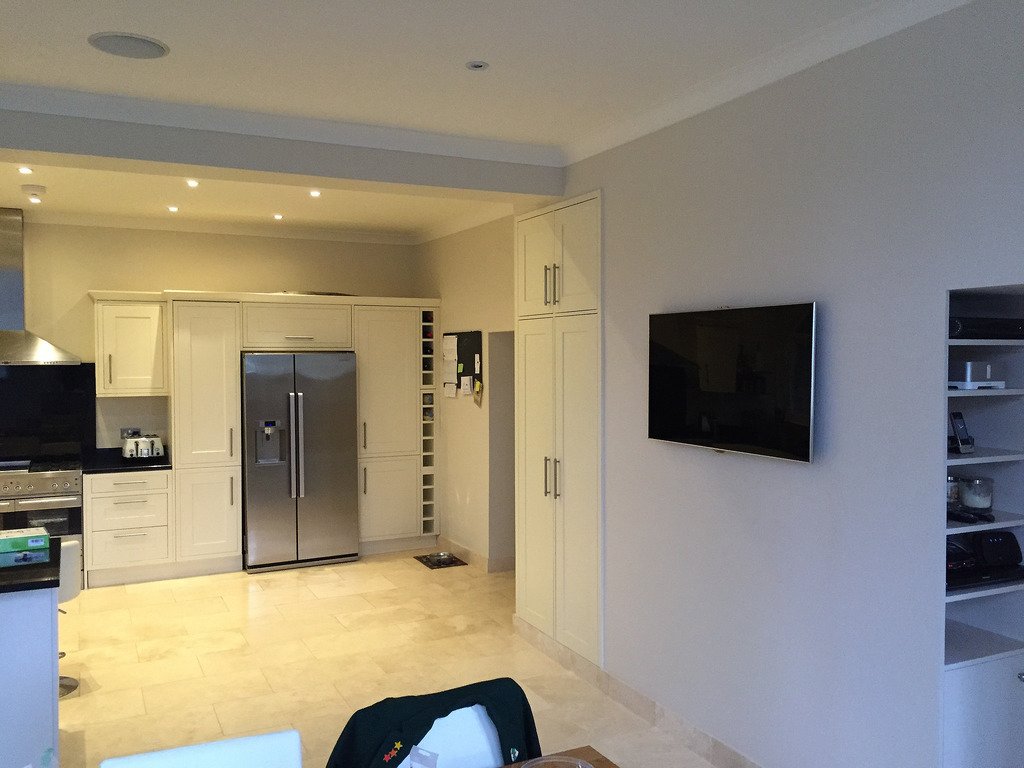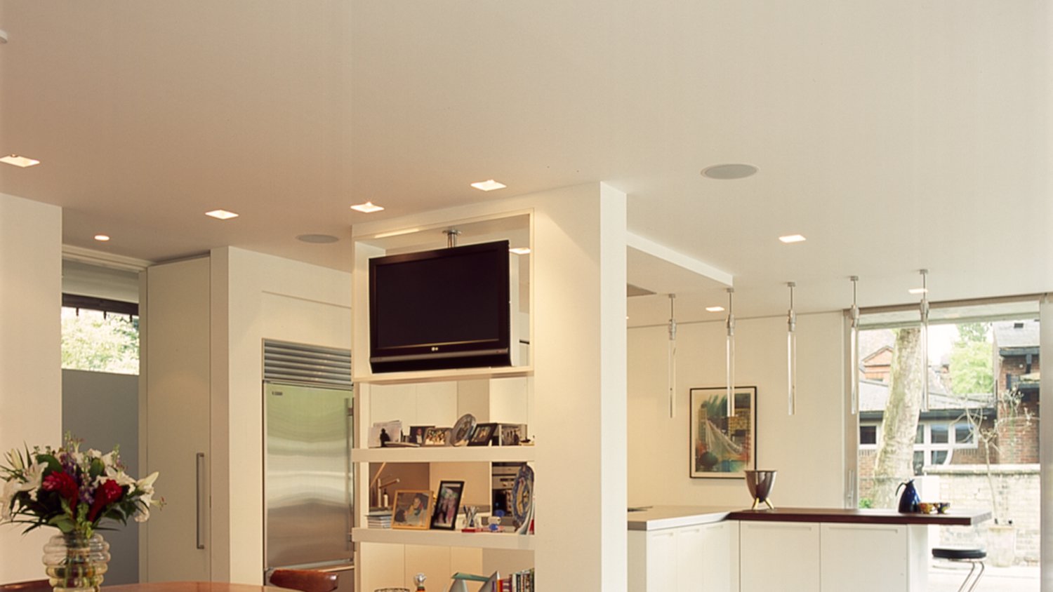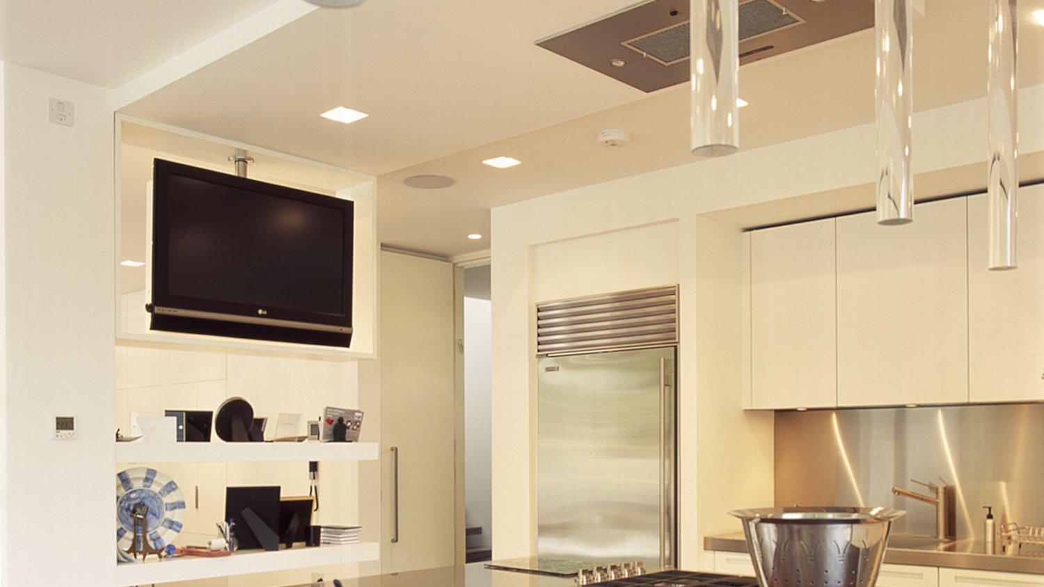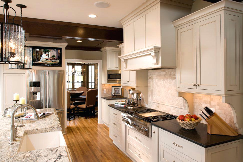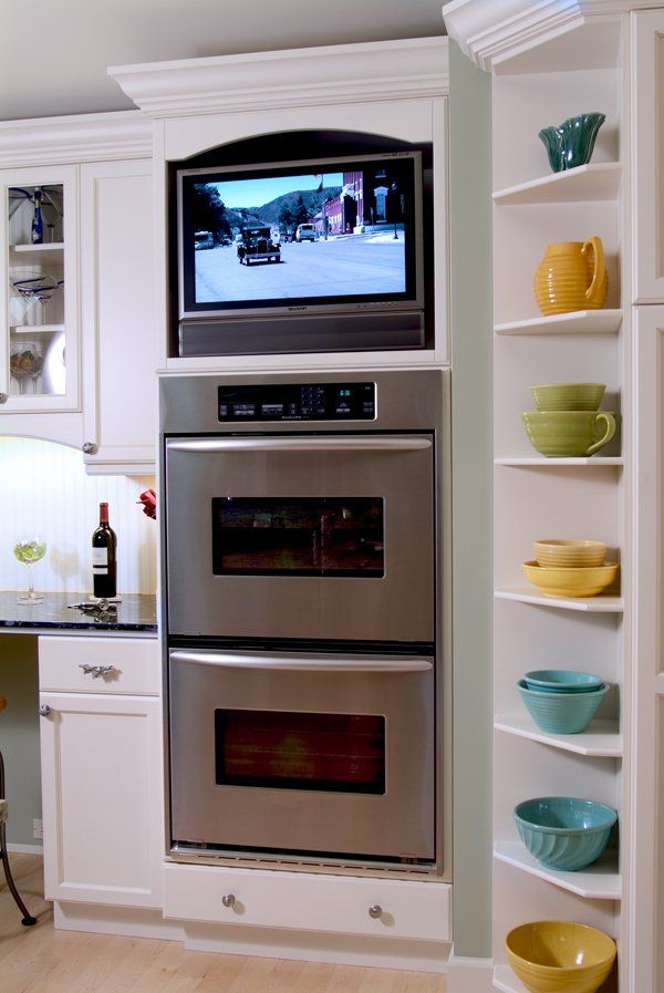 A menudo, los televisores en la cocina se encuentran en nichos especiales. Puede formar parte del conjunto de cocina frente a la mesa del comedor o grupo suave. El equipo se instala en un nicho del segundo nivel de cualquier sección de la cocina. Si el panel está bien ajustado, puede ver la televisión solo con las puertas del gabinete abiertas, lo que no siempre es conveniente. Si la cocina no está ocupada con las paredes de los estantes, puede crear un nicho especial para el televisor a partir de láminas de paneles de yeso. El tamaño del nicho está determinado por las dimensiones del dispositivo. Puede pintar la pared posterior del nicho en el color del juego de cocina o paneles adyacentes para que no sea tan llamativo. El nicho para el panel de televisión se puede colocar a la altura de los ojos o bajo el techo. Su ubicación depende de las dimensiones del equipo y del área de la cocina.