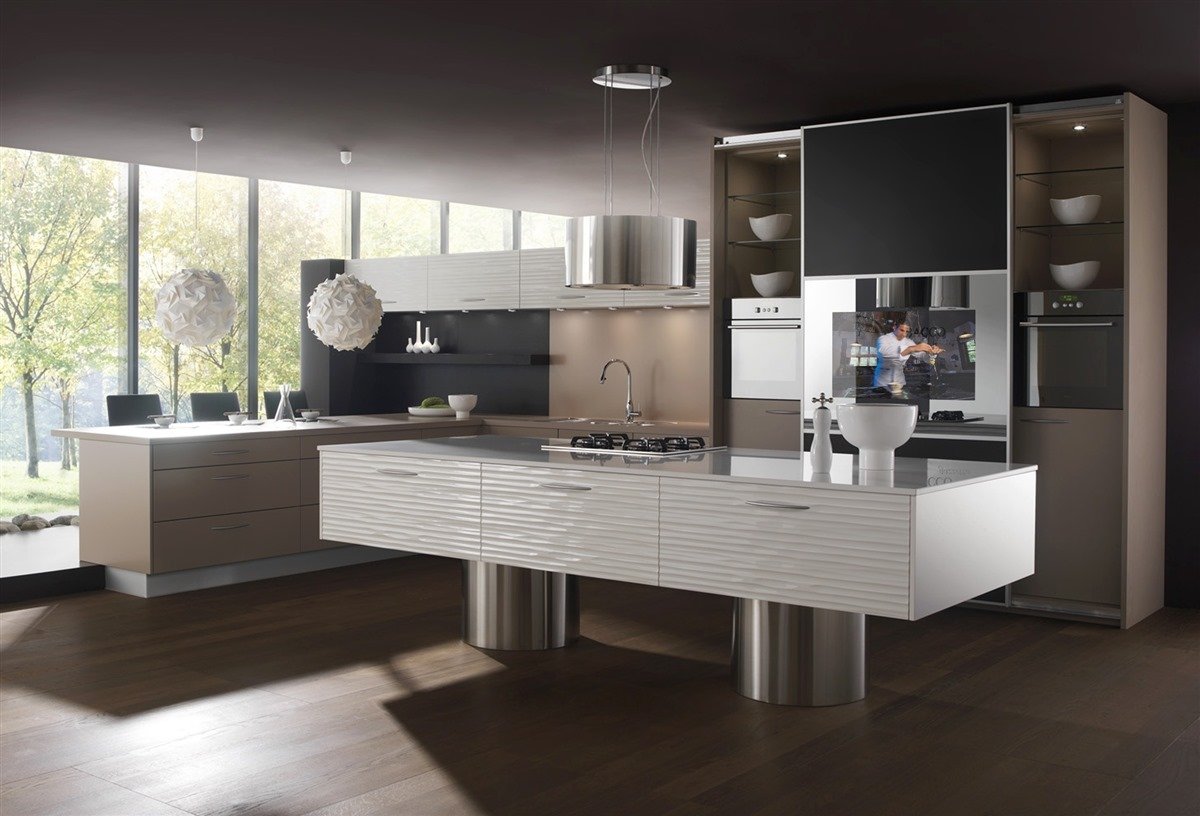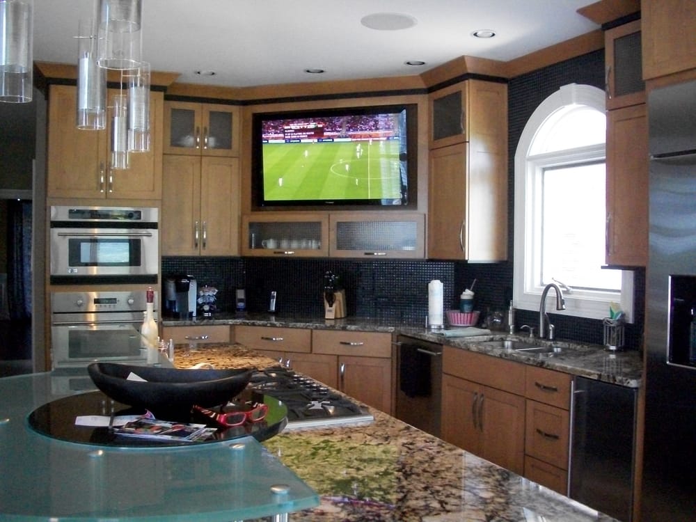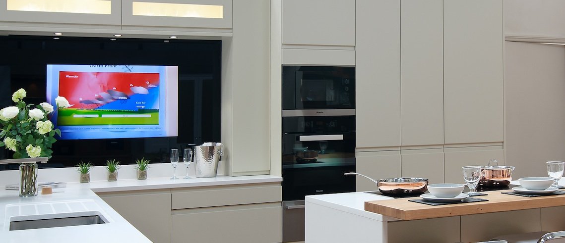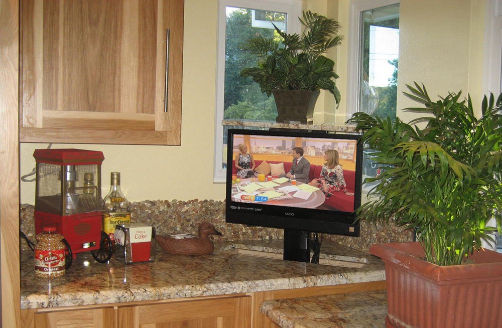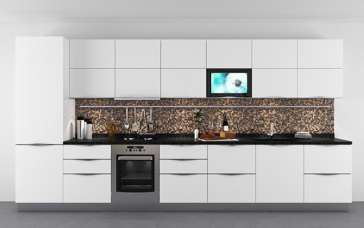Si fantasea bien, puede encontrar muchos lugares inusuales para colocar televisores integrados. El panel de televisión a veces se coloca detrás de un delantal de vidrio, que se utiliza para terminar el área de trabajo. En este caso, la pantalla del televisor no estará salpicada ni sucia, porque escondiéndose detrás de un pesado tabique de vidrio. Los electrodomésticos integrados se pueden instalar en una encimera de cocina especial. Además, en el estante puede integrar no solo el televisor, sino también un microondas, una cafetera y un horno. Pero a menudo el equipo está oculto en los muebles. Hoy en día, los televisores a menudo se instalan detrás de los gabinetes. Hay soportes retráctiles especiales en los que se fija el dispositivo. Cuando presiona un botón en el control remoto, el panel de televisión sale de la parte superior de la cocina. Los televisores integrados populares incluyen: