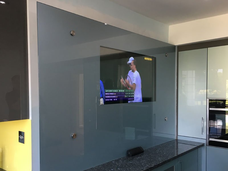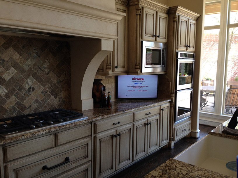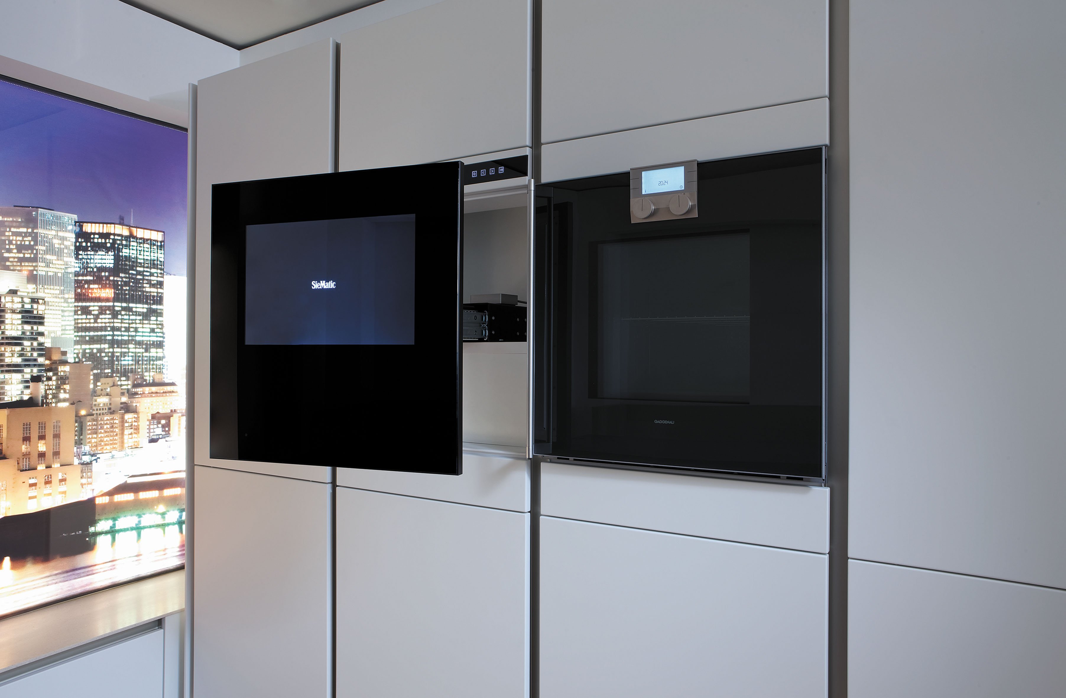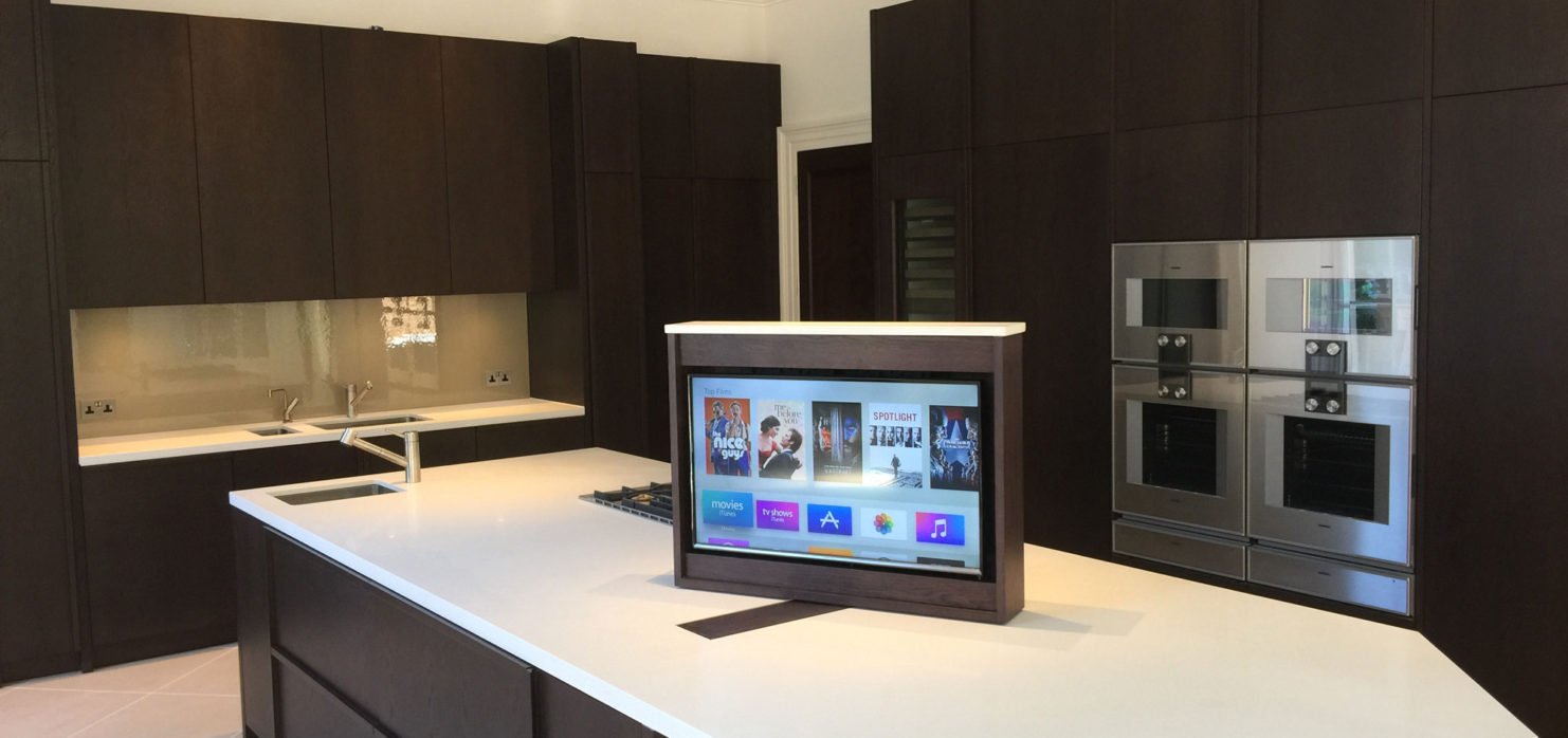 Si fantasea bien, puede encontrar muchos lugares inusuales para colocar televisores integrados. El panel de televisión a veces se coloca detrás de un delantal de vidrio, que se utiliza para terminar el área de trabajo. En este caso, la pantalla del televisor no estará salpicada ni sucia, porque escondiéndose detrás de un pesado tabique de vidrio. Los electrodomésticos integrados se pueden instalar en una encimera de cocina especial. Además, en el estante puede integrar no solo el televisor, sino también un microondas, una cafetera y un horno. Pero a menudo el equipo está oculto en los muebles. Hoy en día, los televisores a menudo se instalan detrás de los gabinetes. Hay soportes retráctiles especiales en los que se fija el dispositivo. Cuando presiona un botón en el control remoto, el panel de televisión sale de la parte superior de la cocina. Los televisores integrados populares incluyen:
