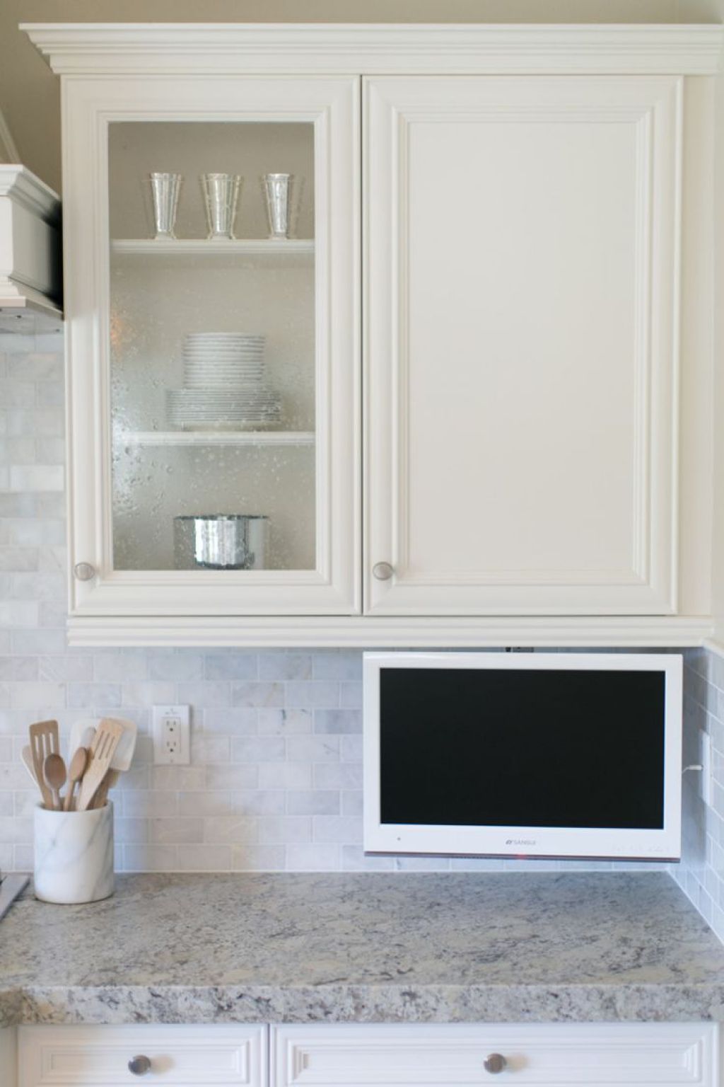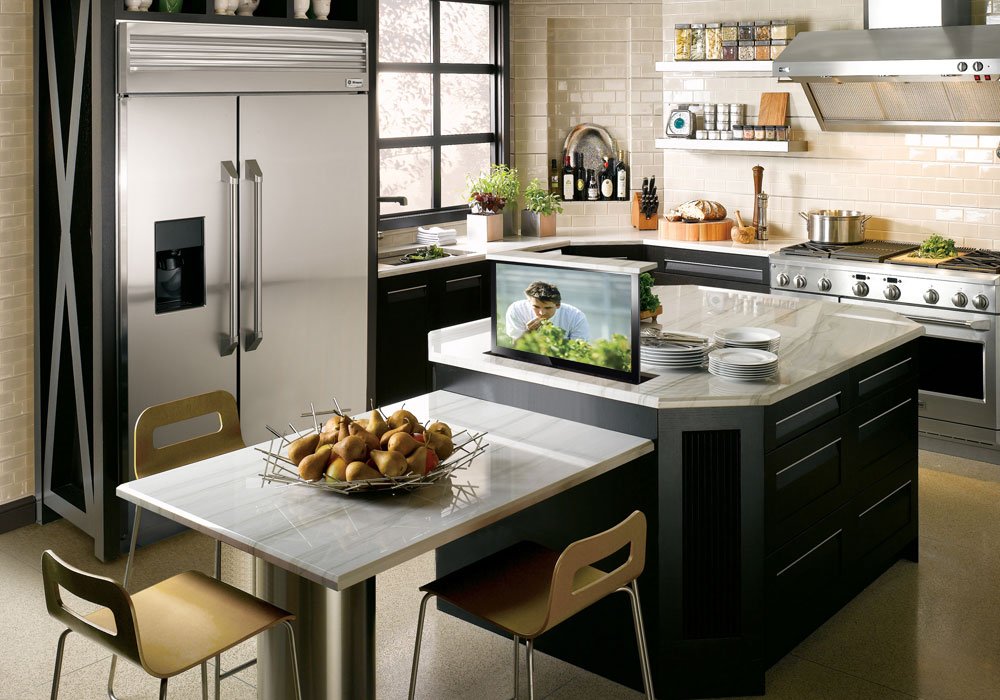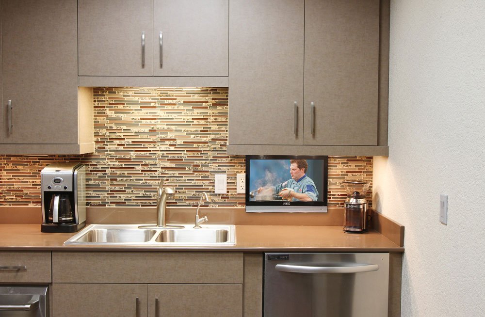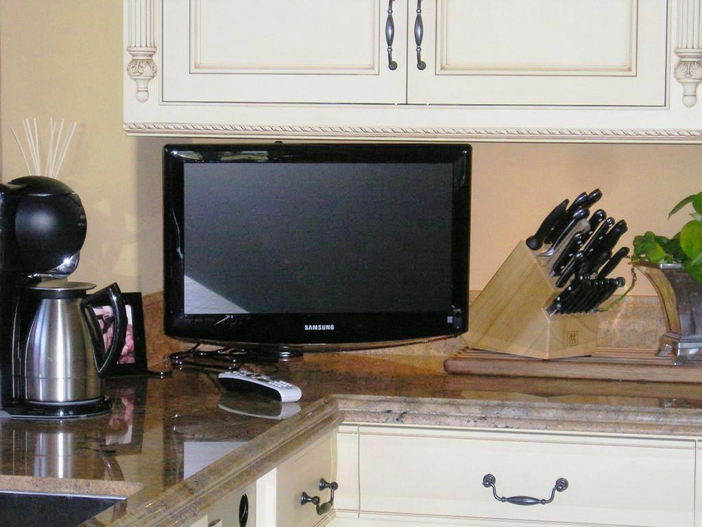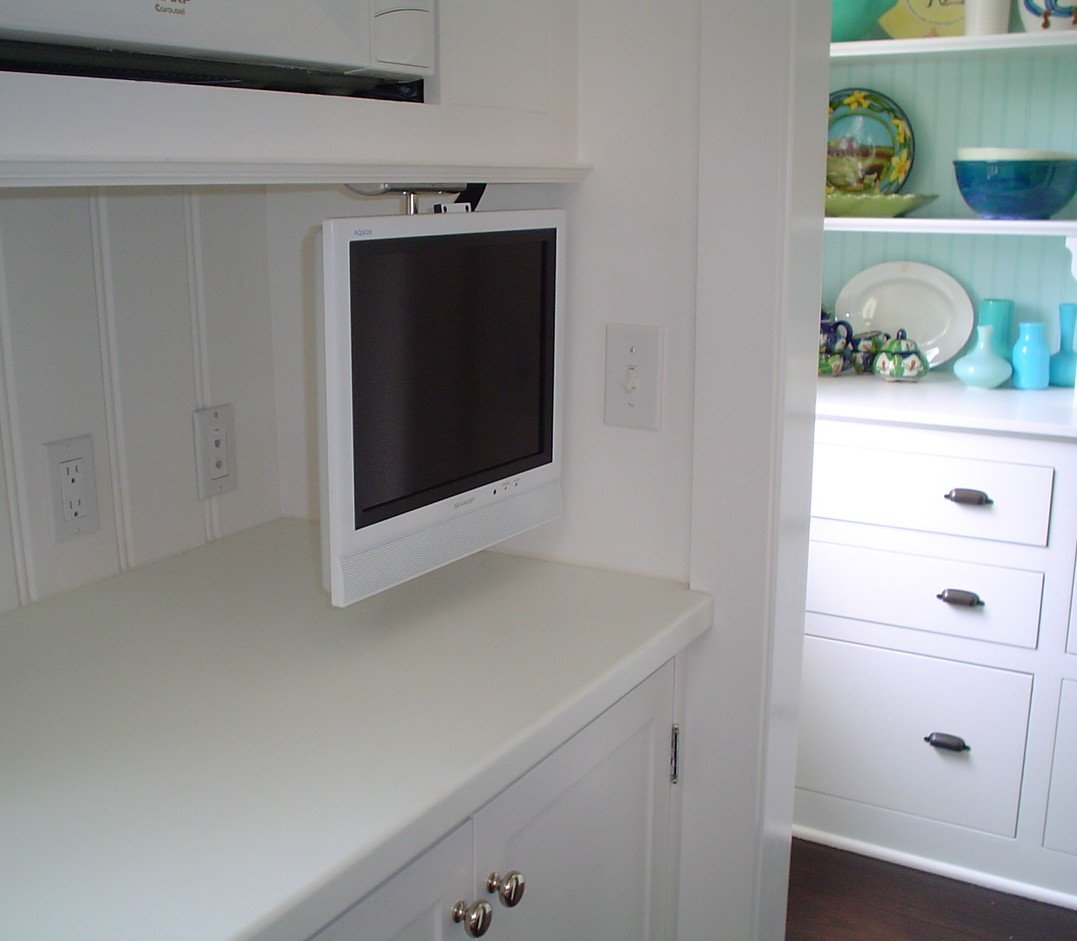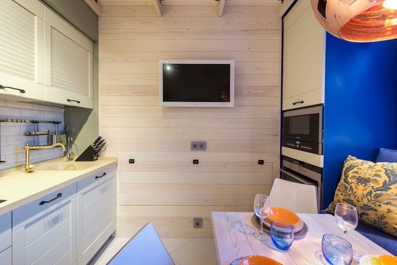 Los televisores plegables se ven elegantes e inusuales en las cocinas modernas. Se pueden montar en la pared o debajo del armario de la cocina. Por supuesto, se utilizan modelos especialmente delgados para estos fines, que cuando se pliegan ocupan muy poco espacio. El equipo es inmune a la humedad y al calor, lo que garantiza un funcionamiento a largo plazo.Los televisores plegables son funcionales y se integran fácilmente en el sistema Smart Home. Se pueden encender mediante wifi o Smart-TV a través de sistemas de control por voz o gestos. Si instala una alarma GSM en un apartamento o casa, incluso puede encender el equipo de forma remota. Los televisores con bisagras son ideales para cocinas pequeñas y son adecuados para aquellos que están acostumbrados a escuchar programas de televisión mientras cocinan, en lugar de verlos. Debido a las características funcionales, estos dispositivos no pueden ser grandes.