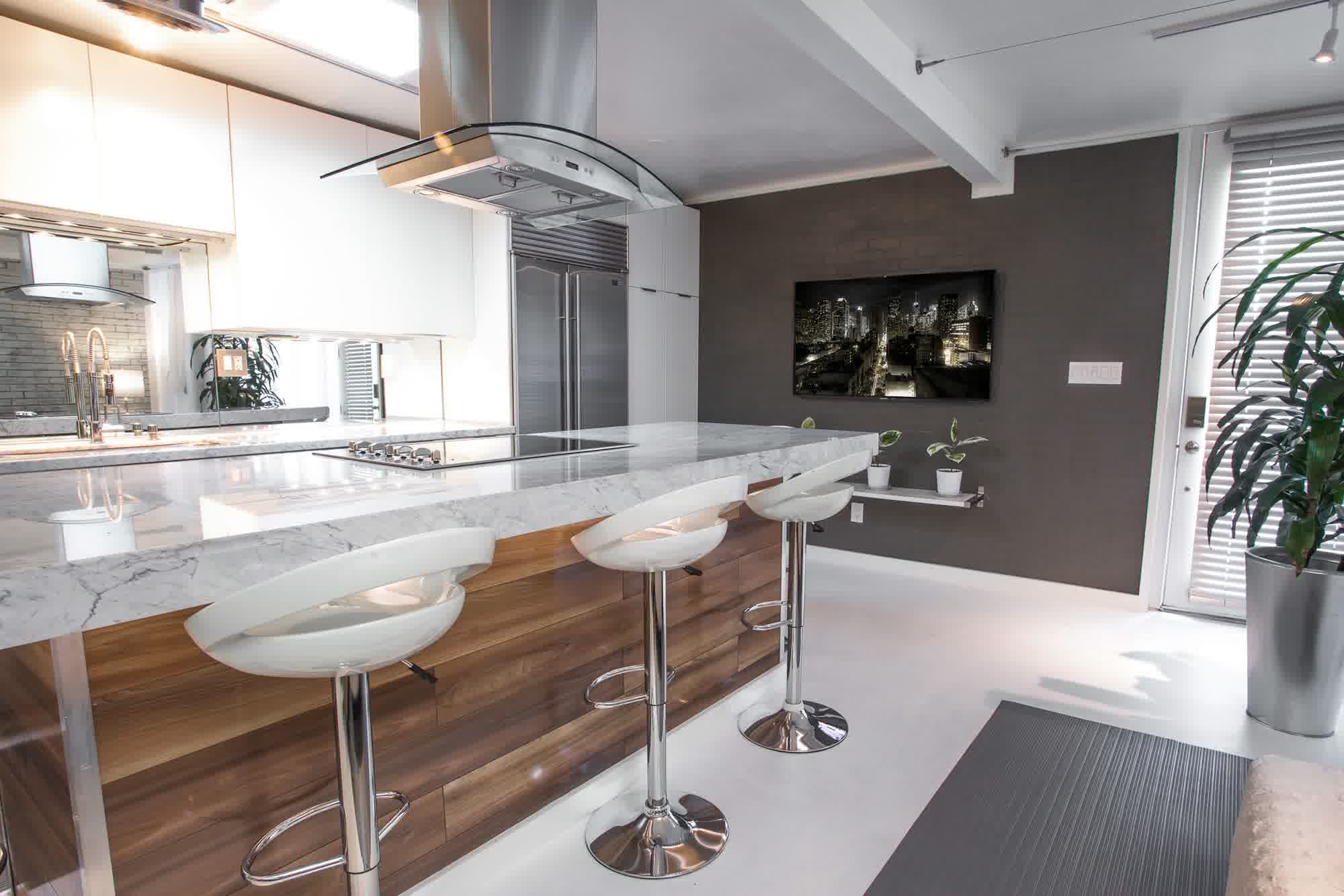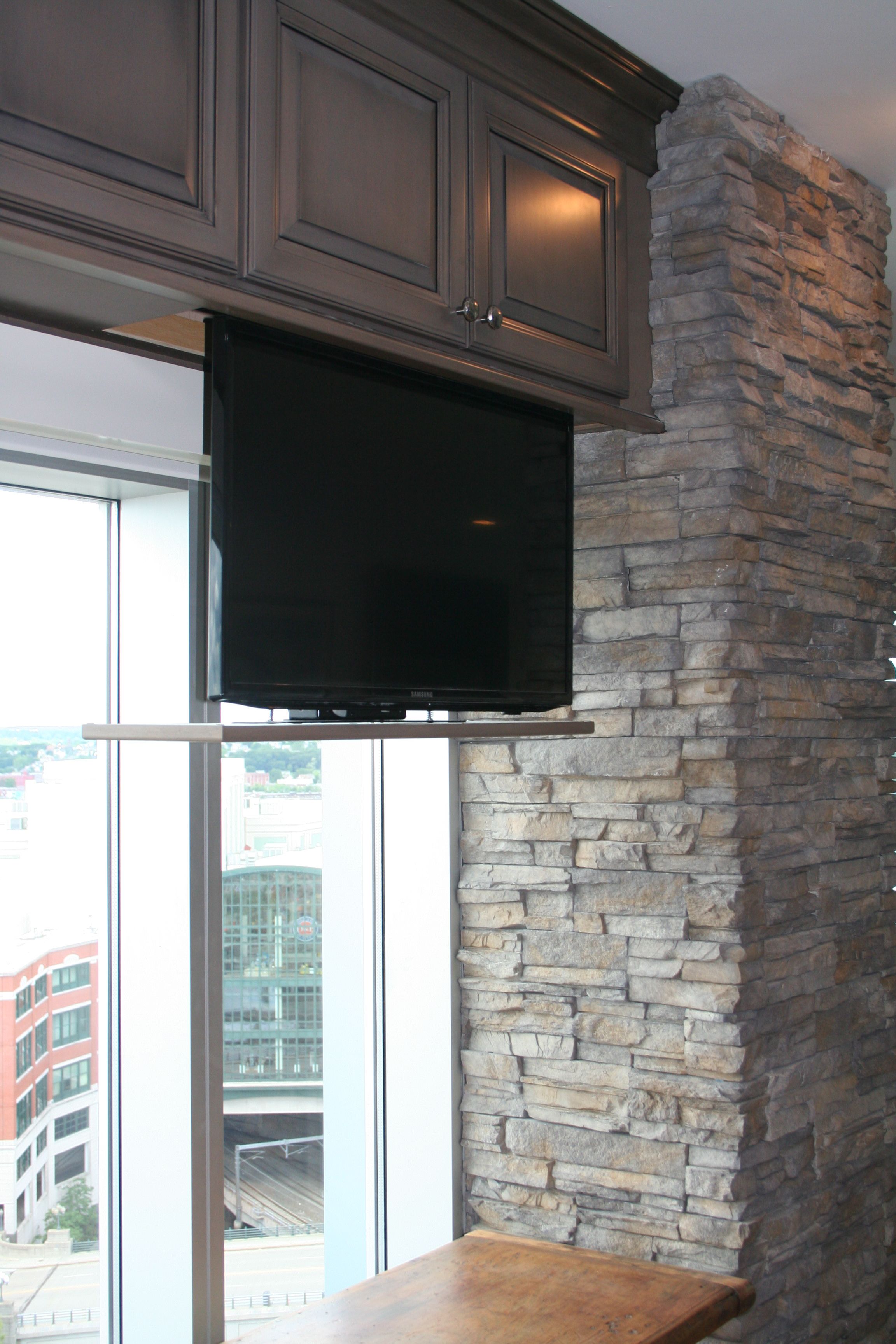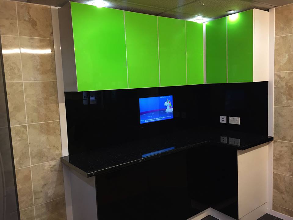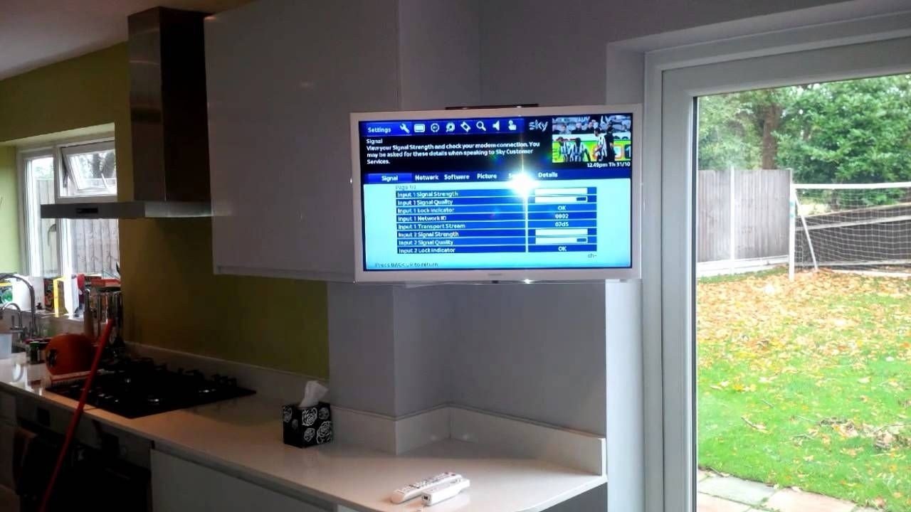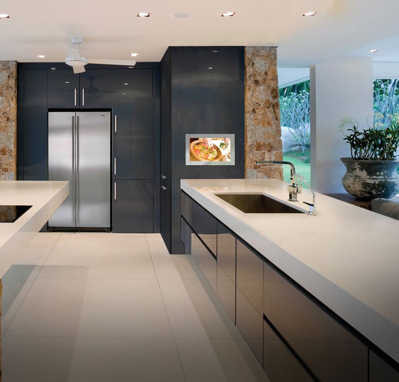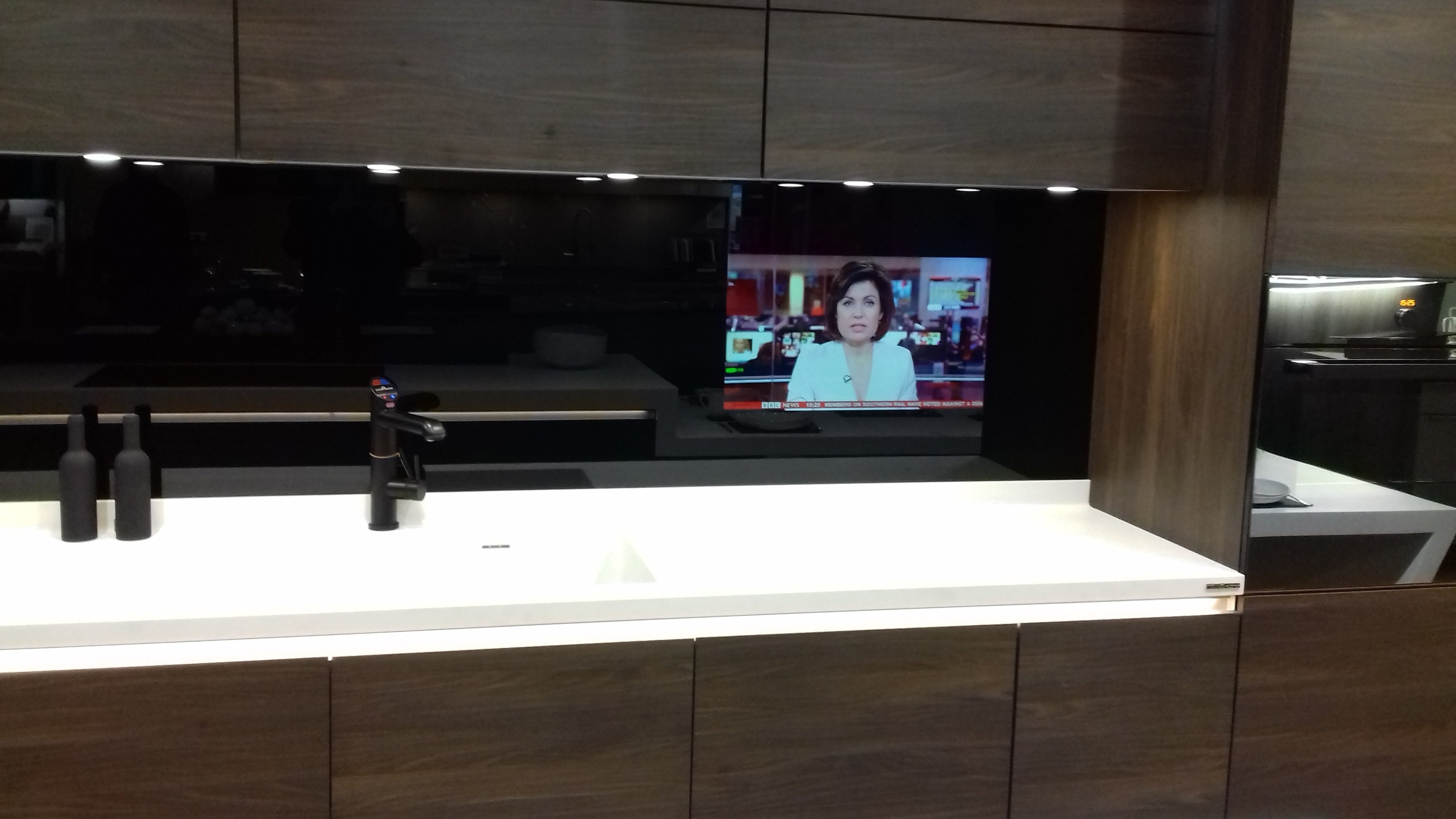 Los televisores plegables se ven elegantes e inusuales en las cocinas modernas. Se pueden montar en la pared o debajo del armario de la cocina. Por supuesto, se utilizan modelos especialmente delgados para estos fines, que cuando se pliegan ocupan muy poco espacio. El equipo es inmune a la humedad y al calor, lo que garantiza un funcionamiento a largo plazo.Los televisores plegables son funcionales y se integran fácilmente en el sistema Smart Home. Se pueden encender mediante wifi o Smart-TV a través de sistemas de control por voz o gestos. Si instala una alarma GSM en un apartamento o casa, incluso puede encender el equipo de forma remota. Los televisores con bisagras son ideales para cocinas pequeñas y son adecuados para aquellos que están acostumbrados a escuchar programas de televisión mientras cocinan, en lugar de verlos. Debido a las características funcionales, estos dispositivos no pueden ser grandes.
