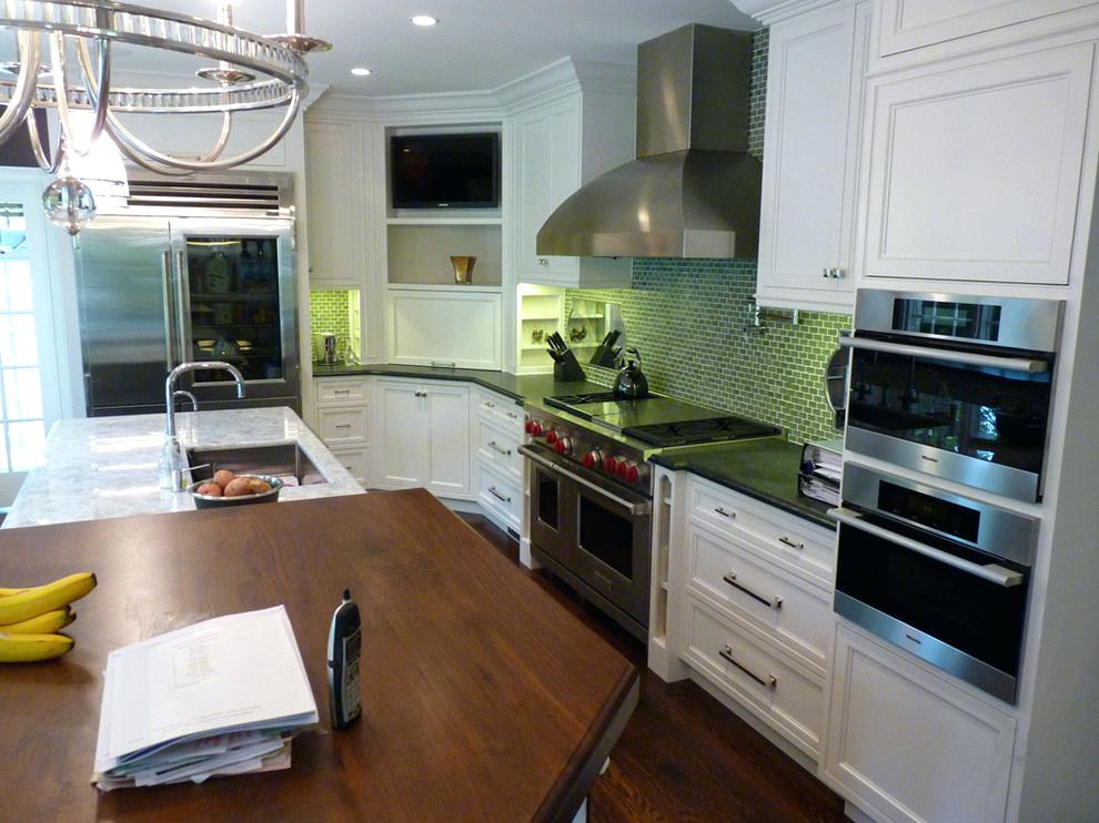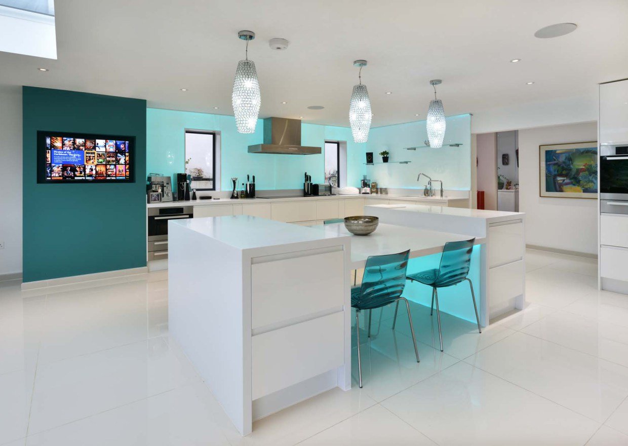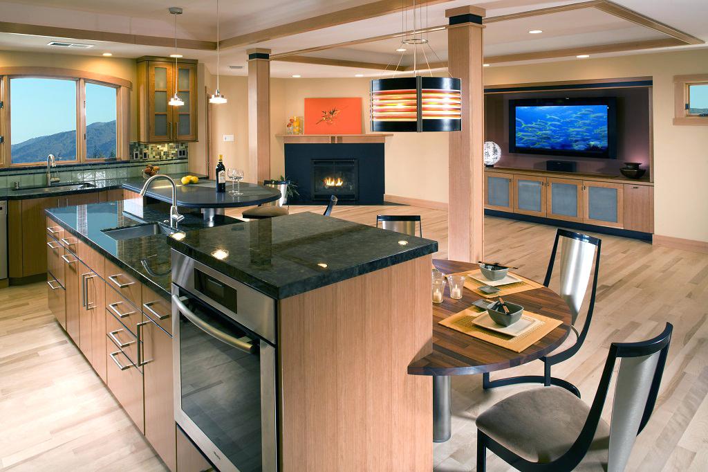 El diseño de una cocina con TV no tiene dificultades, si desde el principio nos centramos en la funcionalidad de la habitación e integramos este dispositivo en el sistema Smart Home. El panel de televisión no debe interferir con el proceso de cocción. El tamaño del televisor depende del área de la cocina. Una pantalla gigante en una pequeña cocina puede causar dolor de cabeza y dolor en los ojos, solo será incómodo de ver. Cuando se instalan en la cocina, muchos propietarios ocultan los paneles de televisión debido a varias soluciones de estilo. Si el proyecto de diseño lo permite, el equipo no está oculto. A veces se centran en equipos de televisión con la ayuda de paneles especiales, iluminación en un nicho o imágenes brillantes y elegantes. En cuanto a los soportes, para la instalación de televisores debe elegir soportes giratorios e inclinables.