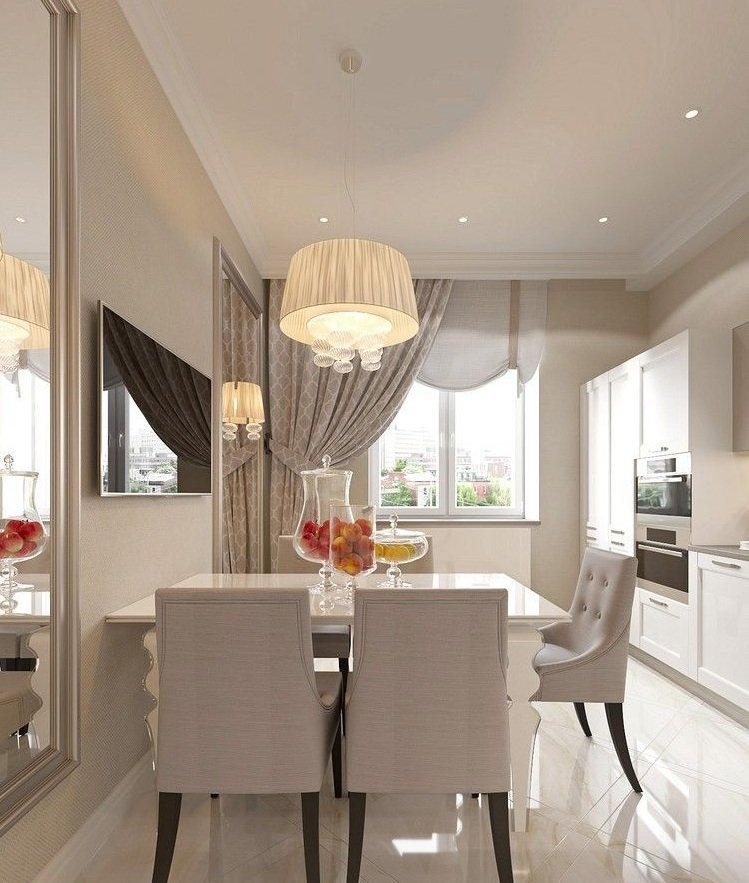 No tiene sentido concentrarse en el televisor en la cocina, por lo que puede esconderlo en un armario. Los orificios de los cables deben estar en la parte posterior del gabinete para no tirar de los cables a través de todo el auricular. También puede ocultar el televisor detrás de paneles deslizantes o pivotantes. La última opción de colocación se ve muy elegante, pero requiere mucho espacio, ya que el panel con el televisor debe girarse 180 grados en un nicho. Si, como parte de un proyecto de diseño, puede instalar un espejo o una imagen en la cocina, entonces puede ocultar un pequeño panel de TV detrás de ellos. El gabinete o la mesa con una mesa de apertura en la que está montado el televisor se ve espectacular. Si el área de la cocina lo permite, el televisor se puede ocultar usando la consola funcional. Esta opción es especialmente adecuada para cocinas en estilos: