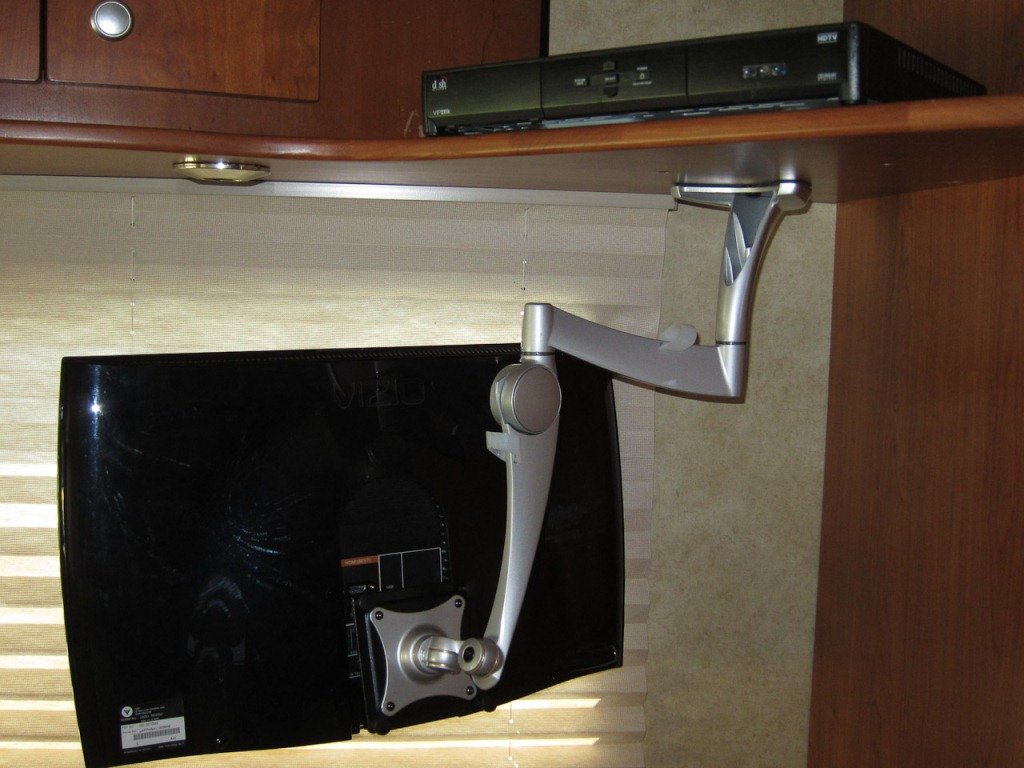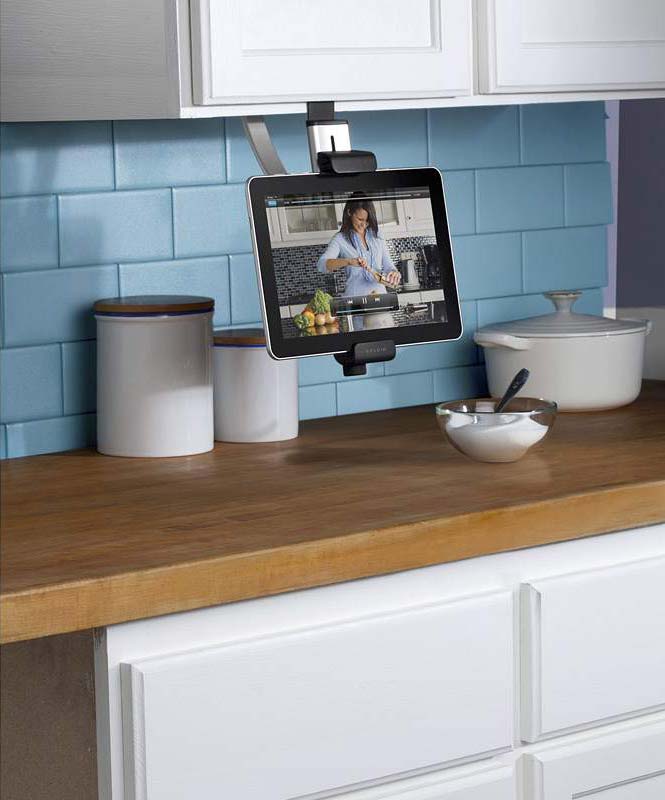 El televisor en la cocina se puede colocar en un soporte giratorio especial. El tamaño del soporte depende de las dimensiones del equipo, pero hay modelos ajustables universales adecuados para dispositivos de diferentes tamaños. Cuestan más que los soportes convencionales, pero son adecuados para diferentes modelos de TV.Hay 4 tipos principales de soportes giratorios: techo, giratorio y giratorio. Los sujetadores inclinados permiten un ángulo de inclinación vertical del equipo de 20 grados. Las estructuras giratorias de inclinación le permiten rotar o inclinar el soporte 180 grados. Los soportes de techo le permiten rotar o inclinar la estructura 360 grados. Además, las estructuras giratorias modernas permiten no solo encender el televisor, sino también empujarlo hacia adelante. Además, hoy se venden soportes inteligentes que pueden cambiar la posición del televisor con el control remoto o incluso a través de Wi-Fi.