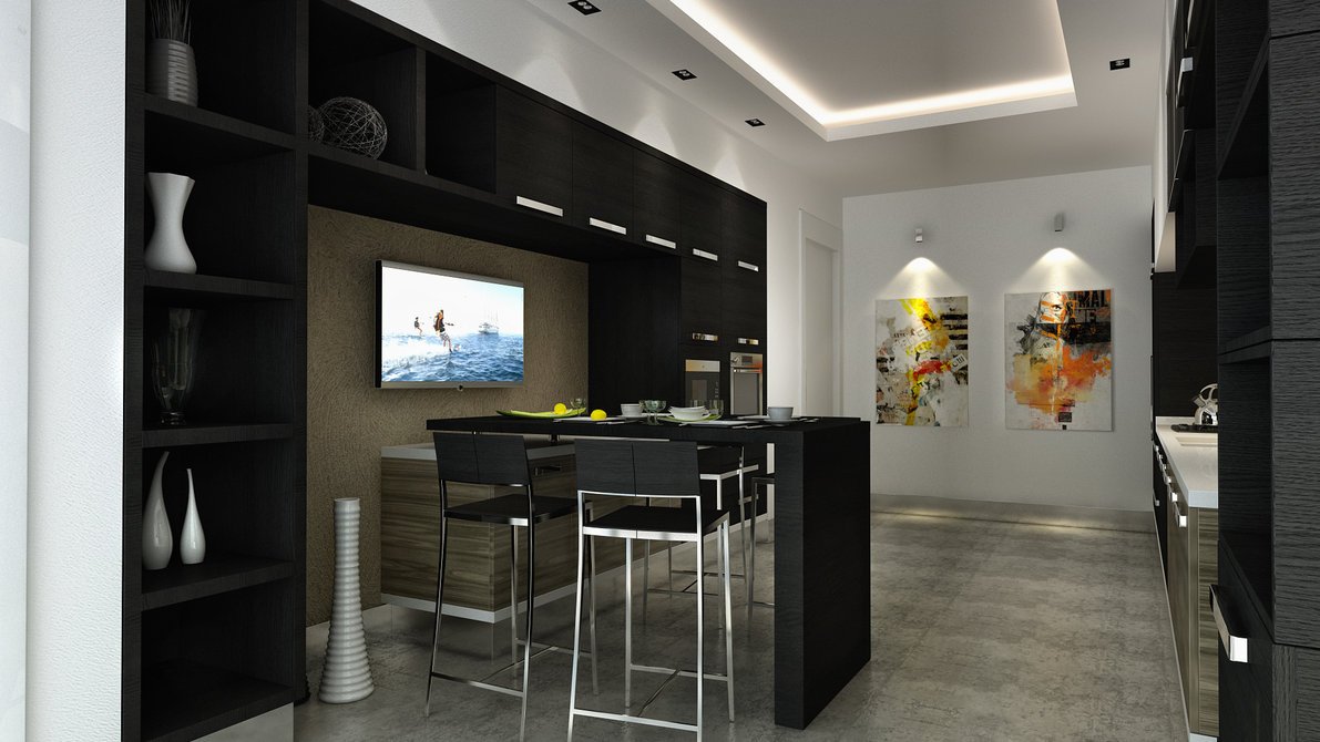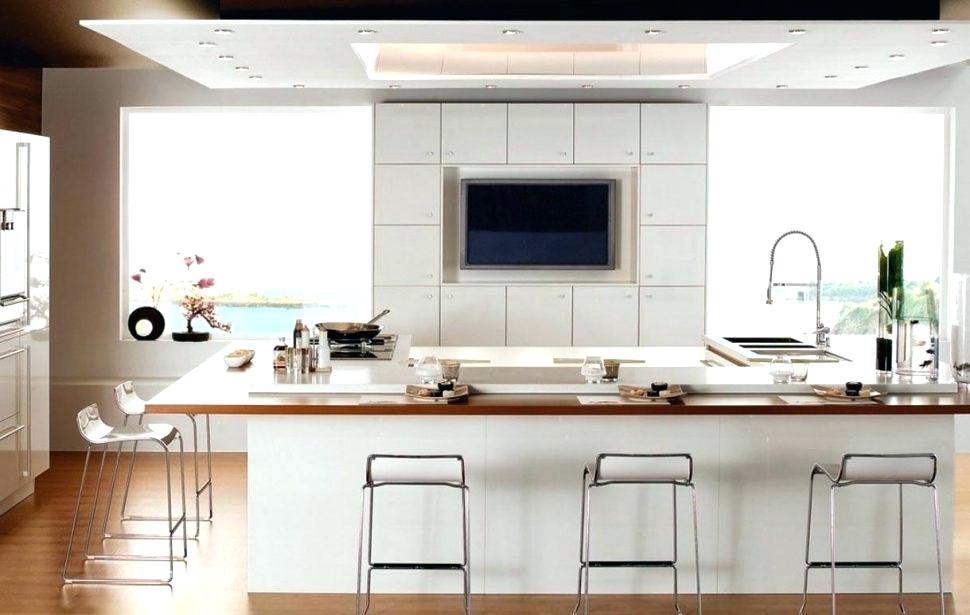 No hay requisitos y reglas claras con respecto a la altura del televisor. Si los miembros de la familia se sienten cómodos, se coloca incluso debajo del techo. Pero en cocinas pequeñas, es más conveniente colocar el equipo a la altura de los ojos, lo que le permitirá mirar programas de televisión o películas durante mucho tiempo en una posición cómoda, y no levantar la cabeza en alto. Para habitaciones pequeñas, ubicación óptima de paneles de televisión a una altura de 1.2-1.5 metros del piso. La altura mínima del televisor desde el piso no debe ser inferior a 1 metro. Si los propietarios están acostumbrados a mirar programas mientras cocinan, entonces instalar un televisor debería ser más alto. En las salas de cocina grandes se permite colocar paneles de televisión directamente debajo del techo. Si esto hace que la imagen se oscurezca, entonces el televisor debe instalarse en un soporte móvil.