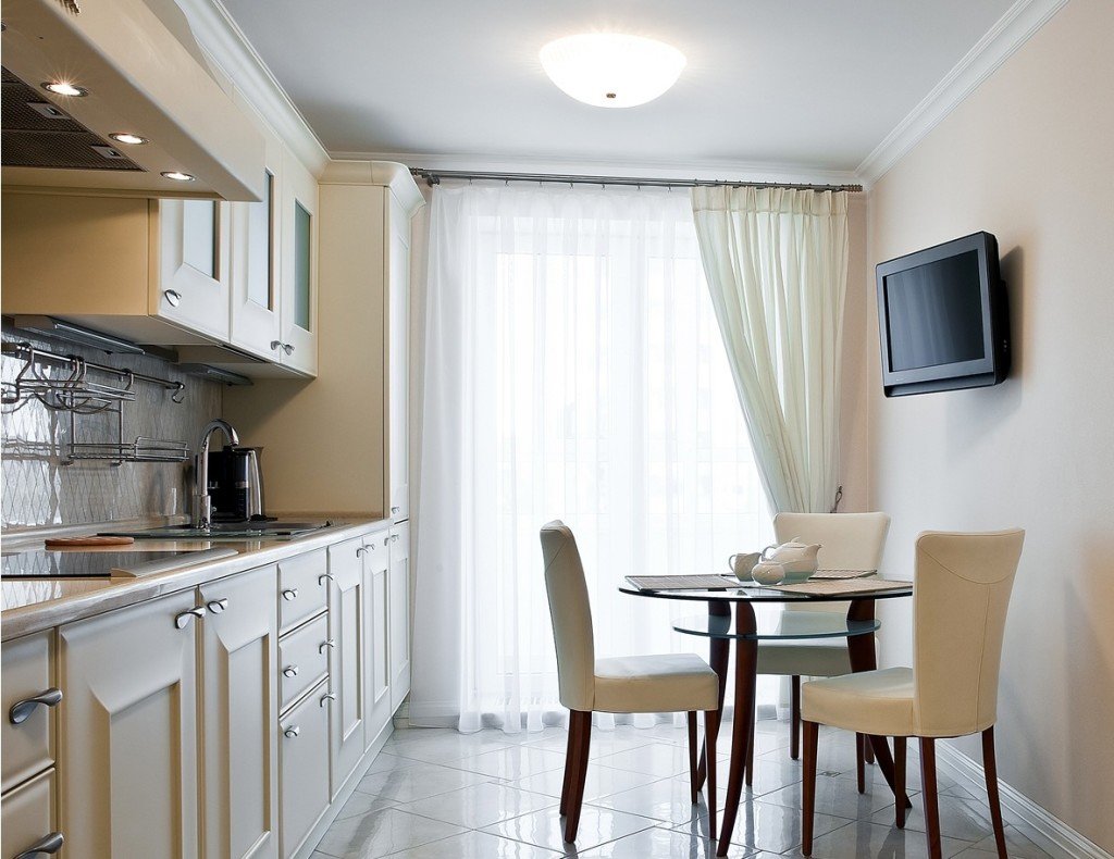 El área del espacio de la cocina afecta el tamaño del equipo comprado. Para cocinas de hasta 8 m2. Los televisores pequeños con una diagonal de hasta 22 pulgadas son adecuados. Además, para habitaciones pequeñas, debe elegir dispositivos con una pantalla a prueba de humedad, ya que en tales cocinas existe el riesgo de salpicaduras y manchas en la pantalla durante la cocción. Para cocinas de 9 a 15 m2. Montar paneles de TV con una diagonal de hasta 32 pulgadas. Pero el dispositivo debe ubicarse a una distancia de 3 m de la persona que mira, para que no haya tensión excesiva en los ojos. En cocinas más grandes, puede instalar salas de cine completas con una diagonal de 32 pulgadas.Pero tales instalaciones de cocina se encuentran con mayor frecuencia en hogares privados o se obtienen después de conectar la cocina y la sala de estar en apartamentos comunes. Para una vivienda típica, los modelos de TV con una diagonal de 22 pulgadas son adecuados: