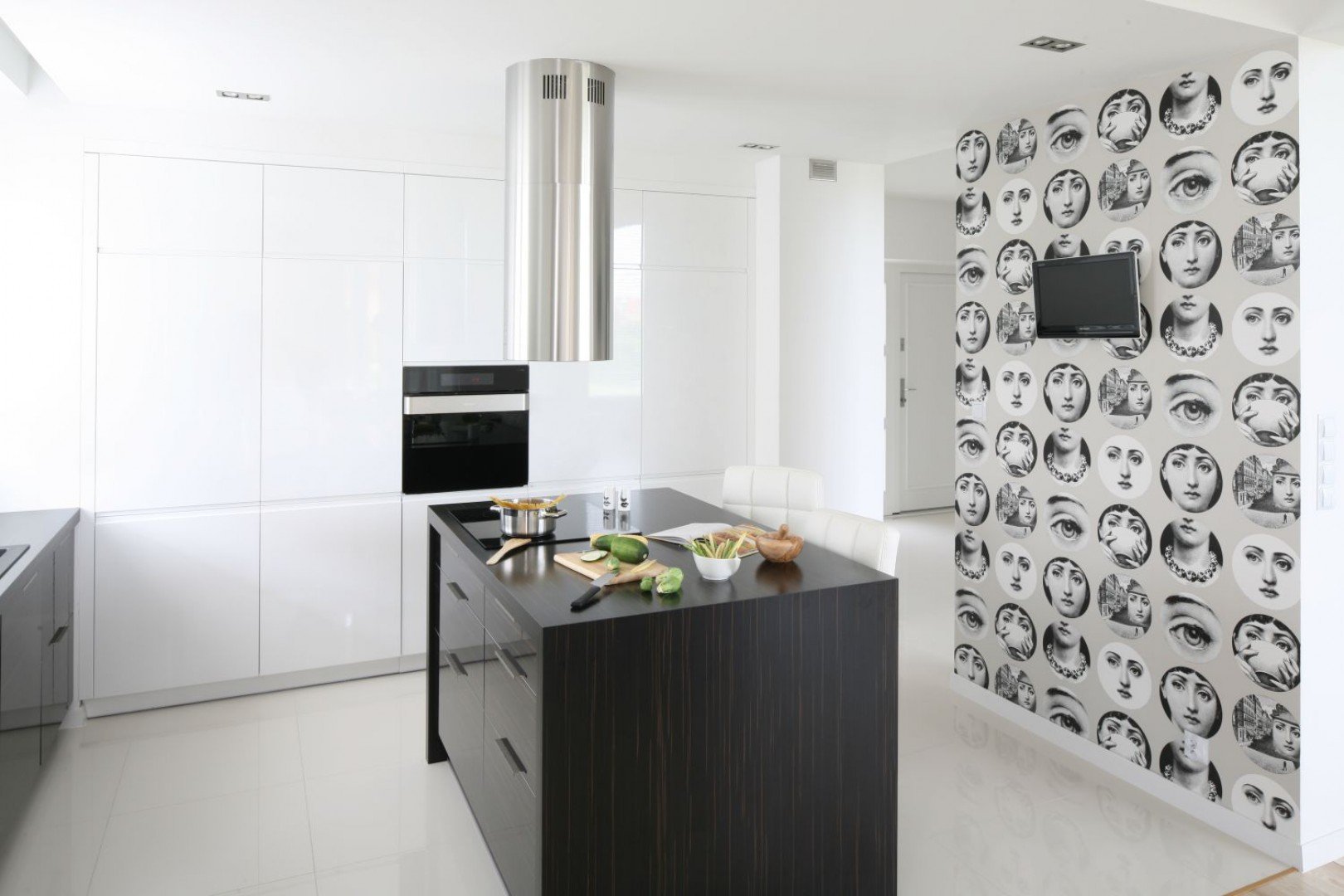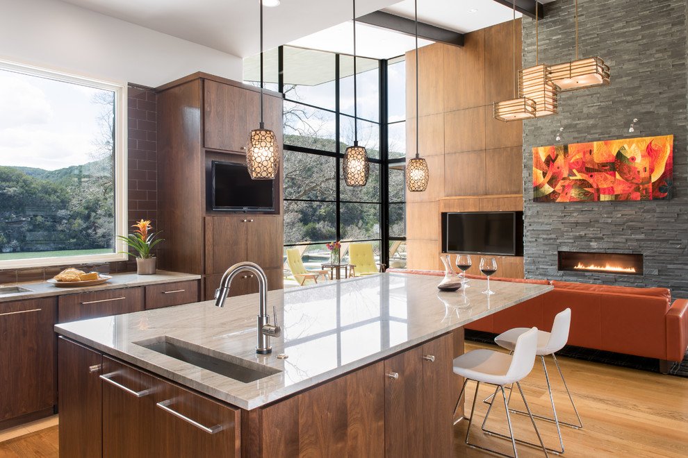 El panel de televisión en la cocina se puede colocar en los módulos de muebles terminados o en uno de los gabinetes de los auriculares. Entonces no hay necesidad de diseñar especialmente esta pared. Si el televisor está en un estante abierto con bisagras, puede colocarle figuras o pinturas estilísticamente adecuadas. Los nichos de paneles de yeso se pueden pintar al color de las paredes o la unidad de cocina, decorarse con patrones inusuales o iluminación incorporada. El televisor también se puede montar en paneles brillantes y sobresalientes. Están hechos de madera, plástico, metal, mármol y otros materiales.Los paneles se ven elegantes y con estilo, pero no son adecuados para cocinas pequeñas. Si el televisor está montado directamente en la pared, se recomienda colgar fotos o fotografías de miembros de la familia al lado. Esta opción de diseño está disponible incluso con un presupuesto mínimo y se adapta a cualquier proyecto de diseño.